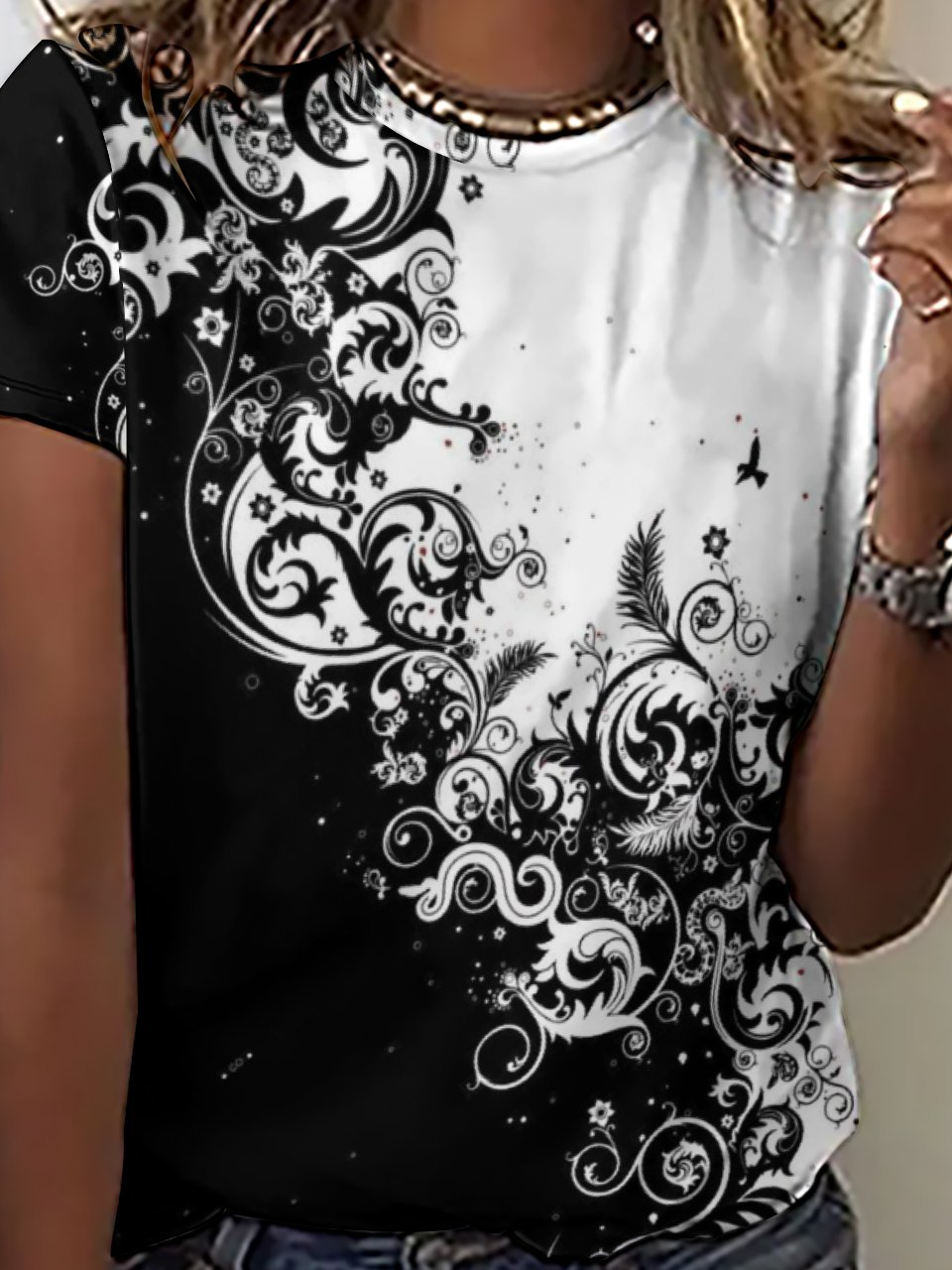 Women's Black White abstract Print Casual Crew Neck T-Shirt