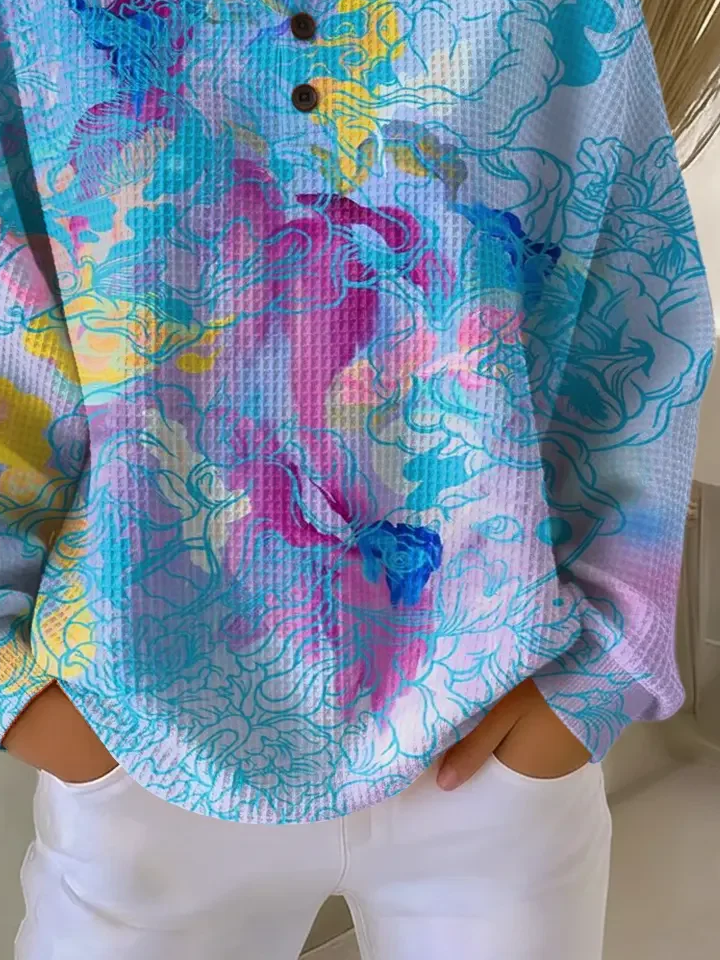 Women's Abstract Print Button-Up Casual Waffle Knit Sweatshirt