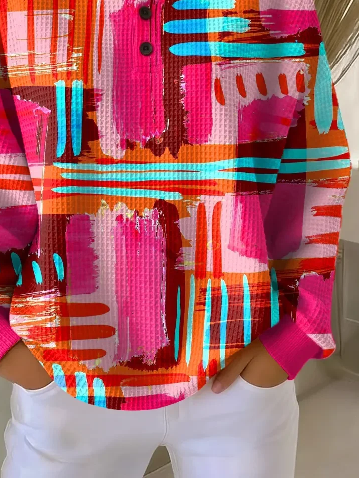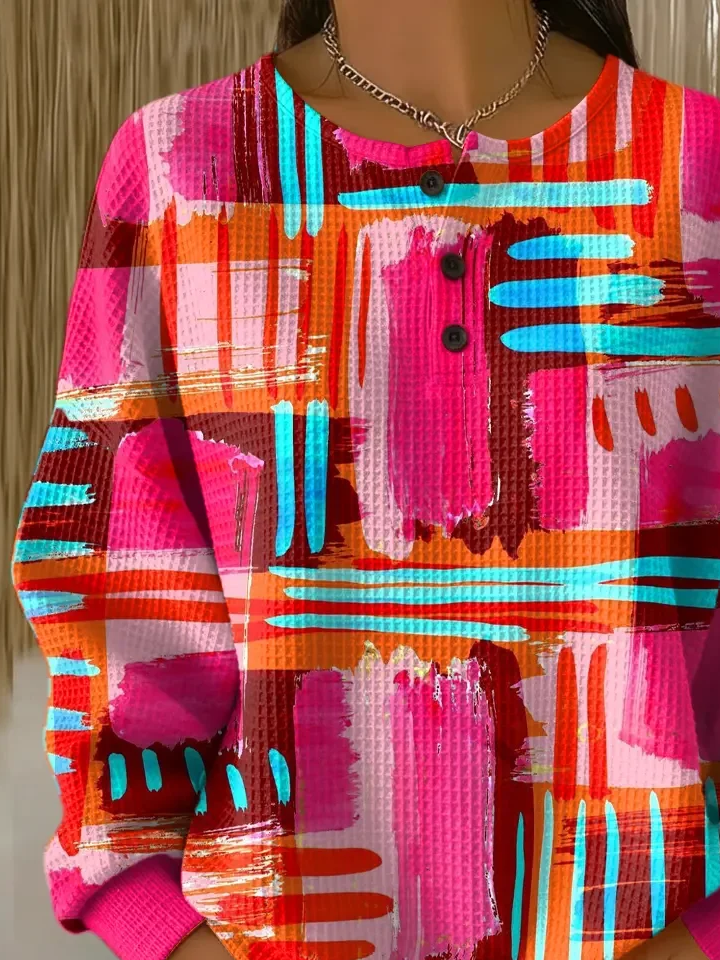 Women's Abstract Print Button-Up Casual Waffle Knit Sweatshirt