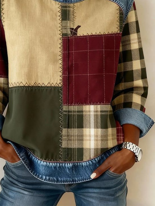 Women's Abstract Print Print Patchwork Denim Crewneck Long-Sleeved Sweatshirt