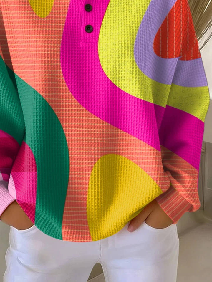 Women's Color Blocking Print Button-Up Casual Waffle Knit Sweatshirt