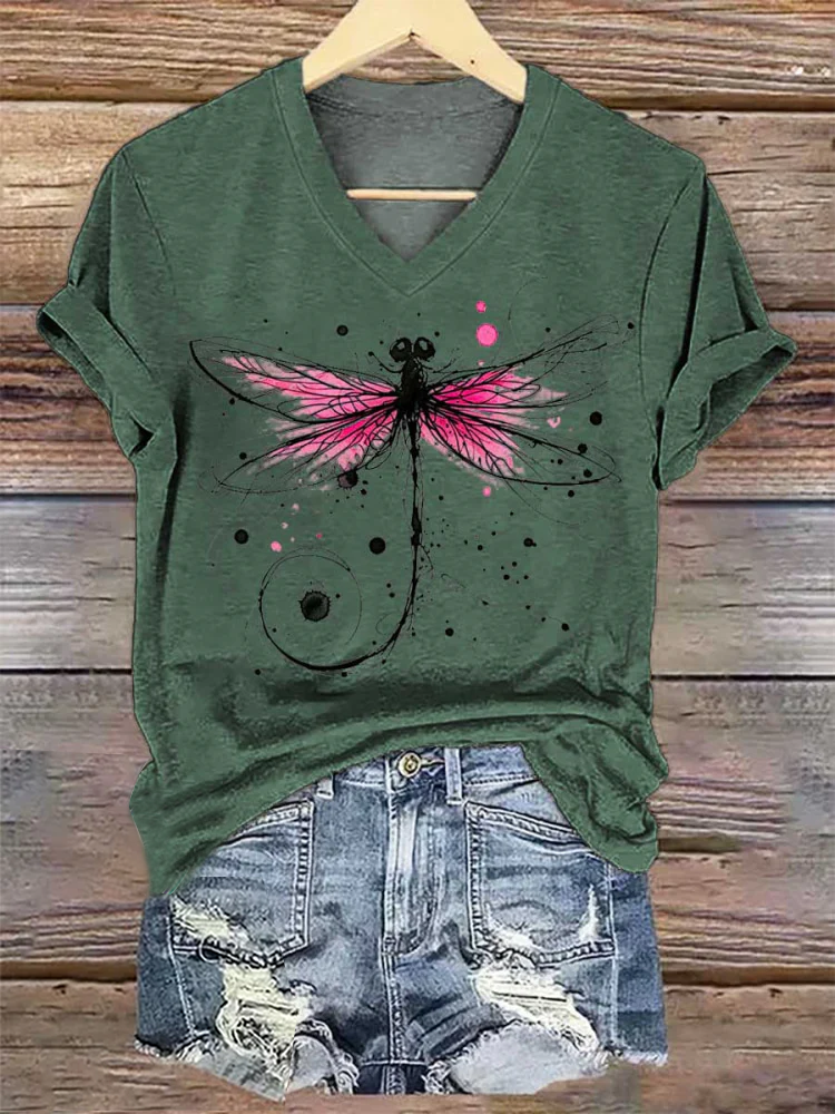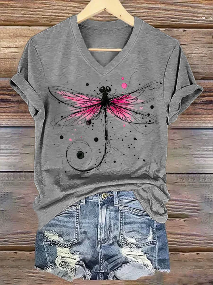 Women's Dragonfly Breast Cancer Awareness V-neck Casual T-Shirt