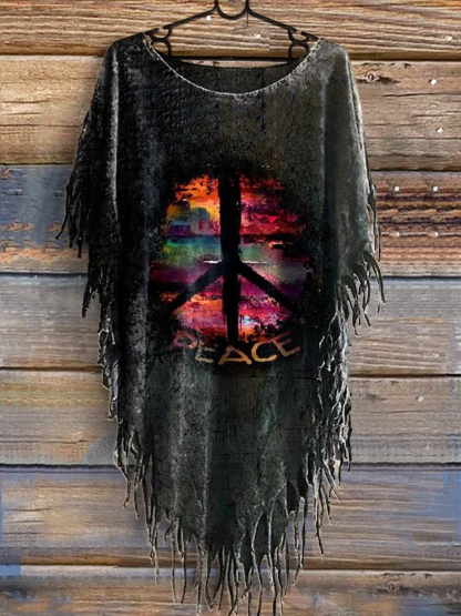 Women's Hippie Peace Art Print Batwing Tassel Fringed Poncho Shirt