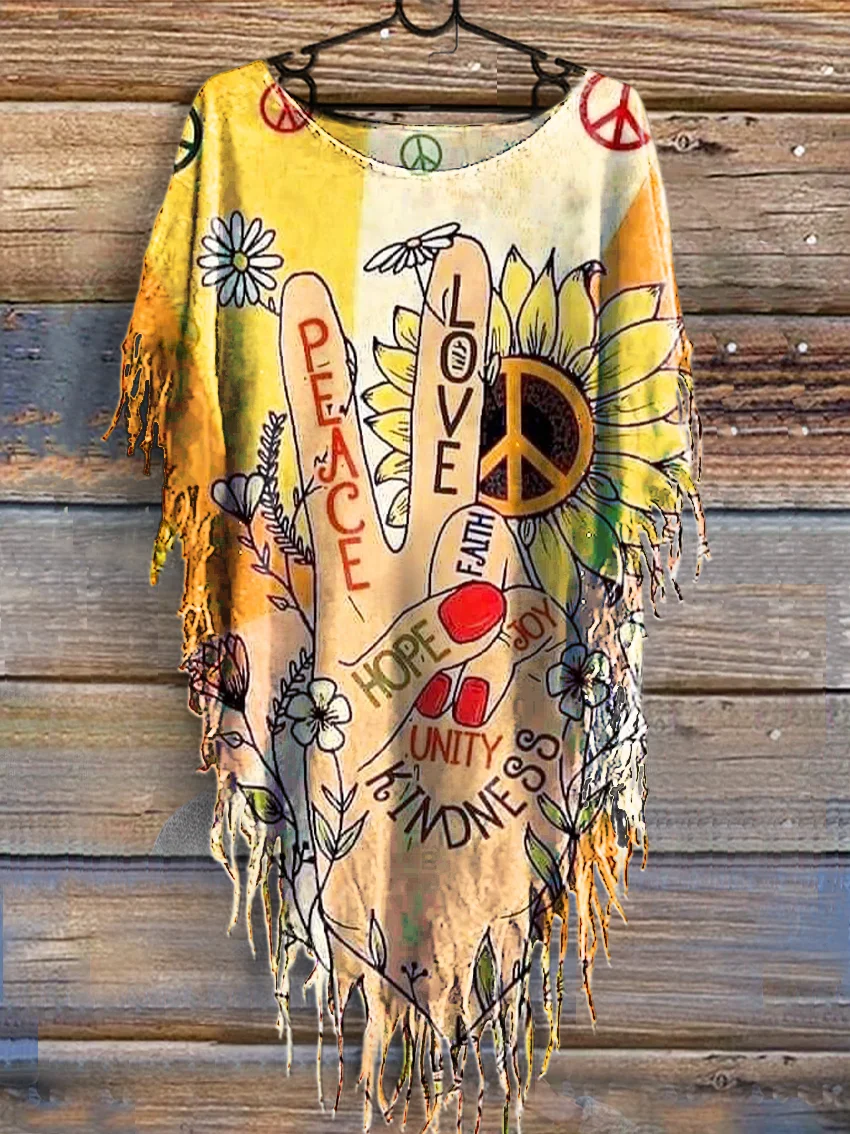 Women's Hippie Peace Love Art Print Batwing Tassel Fringed Poncho Shirt