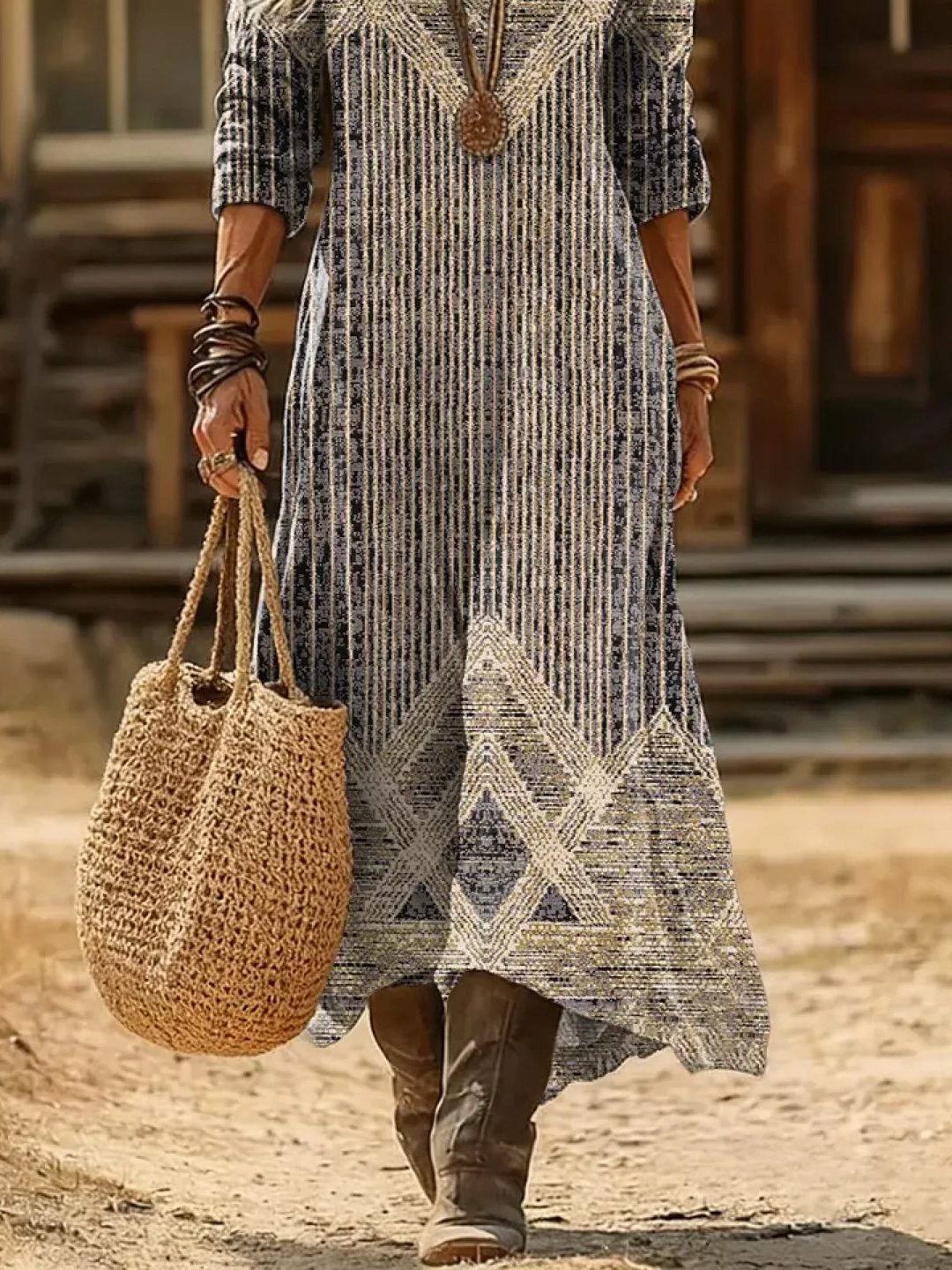 Women's Long Sleeve Spring/Fall As Picture Abstract Printing V Neck Daily Going Out Vintage Maxi H-Line Dress