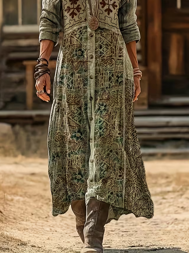 Women's Long Sleeve Spring/Fall As Picture Abstract Printing V Neck Daily Going Out Vintage Maxi H-Line Dress