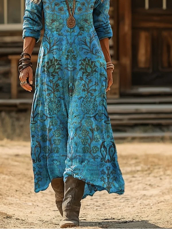Women's Long Sleeve Spring/Fall Blue Floral Printing V Neck Daily Going Out Vintage Maxi H-Line Dress