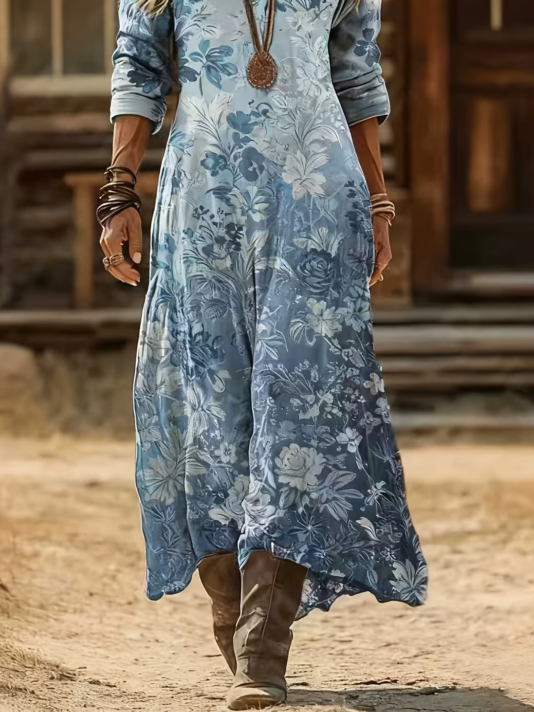 Women's Long Sleeve Spring/Fall Blue Floral Printing V Neck Daily Going Out Vintage Maxi H-Line Dress