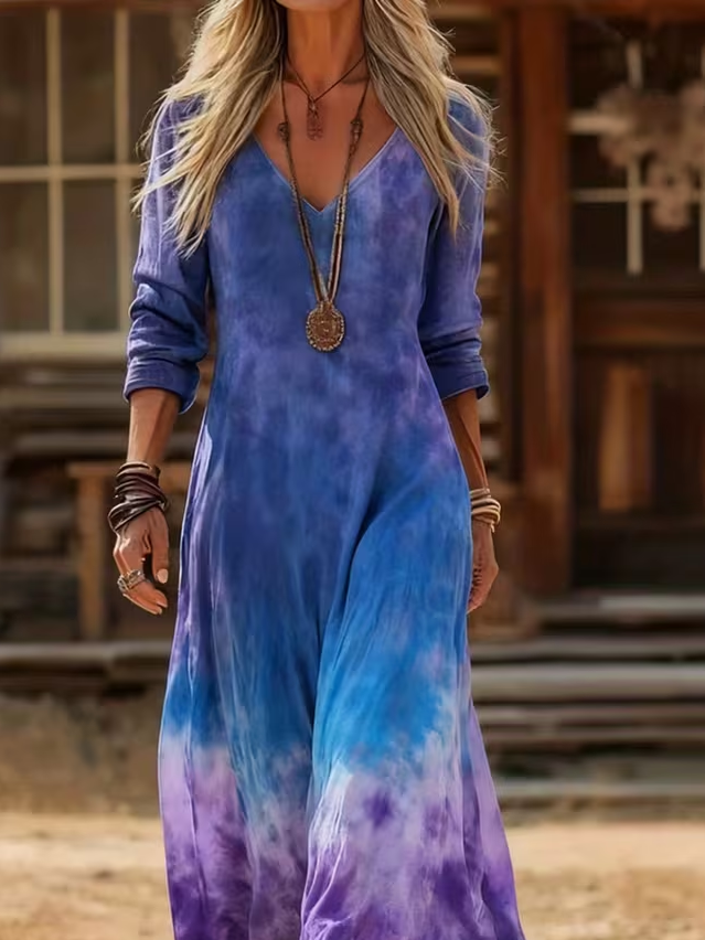 Women's Long Sleeve Spring/Fall Purple Ombre Printing V Neck Daily Going Out Vintage Maxi H-Line Dress