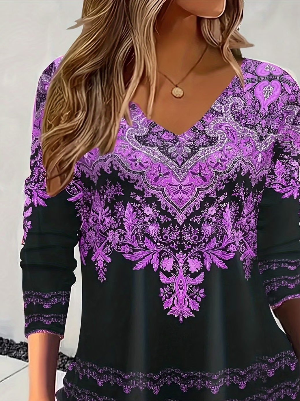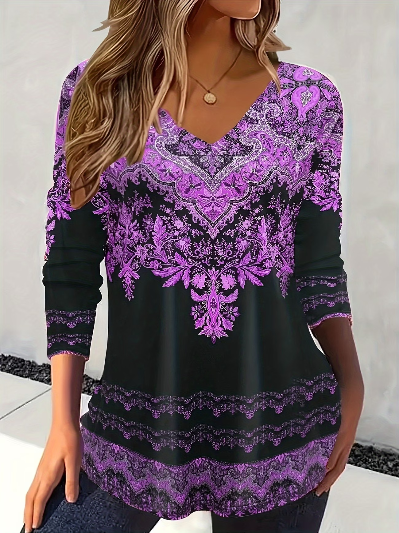 Women's Long Sleeve T-shirt Spring/Fall Purple Ethnic Printing Jersey V Neck Daily Going Out Casual Top