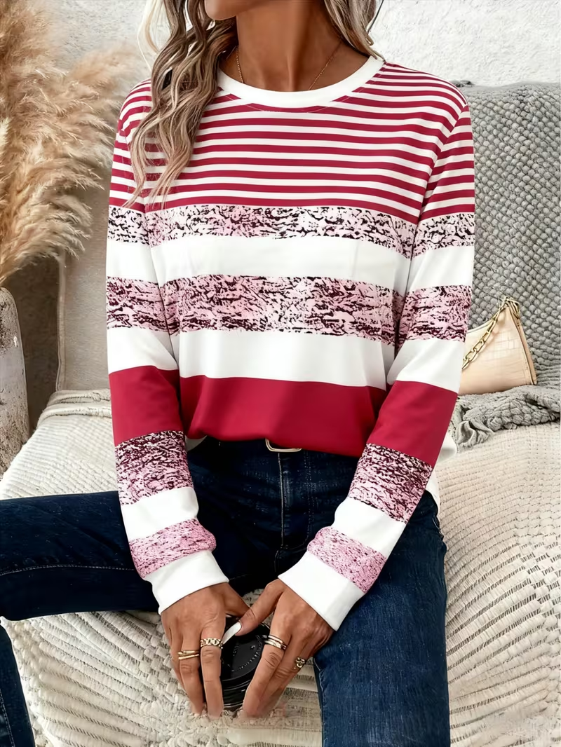Women's Long Sleeve T-shirt Spring/Fall Red Abstract Stripes Printing Jersey Crew Neck Daily Going Out Casual Top
