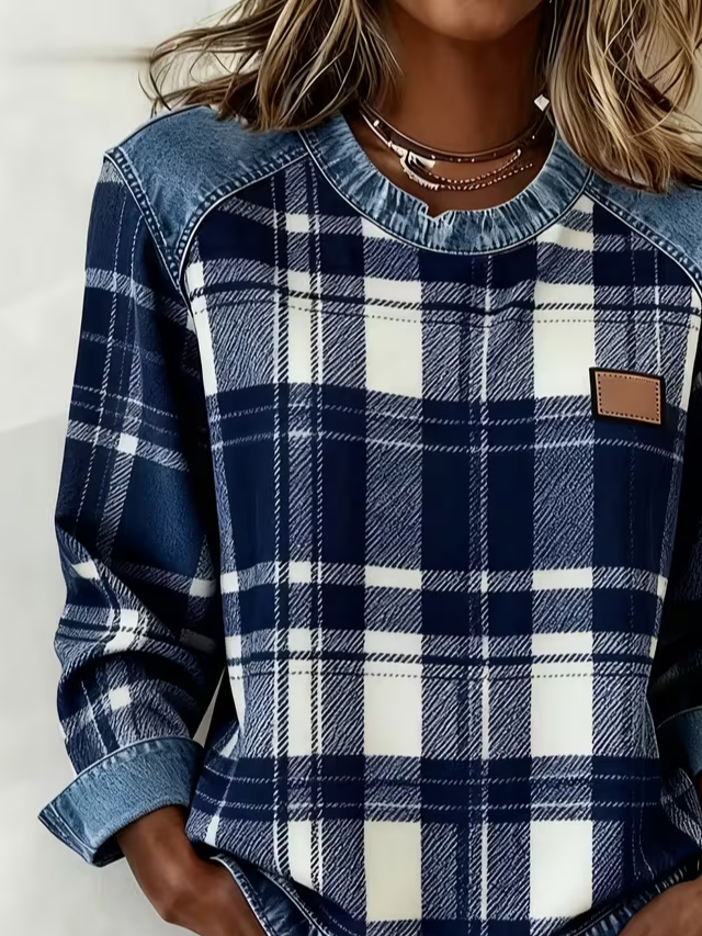 Women's Plaid Print Patchwork Denim Crewneck Long-Sleeved Sweatshirt