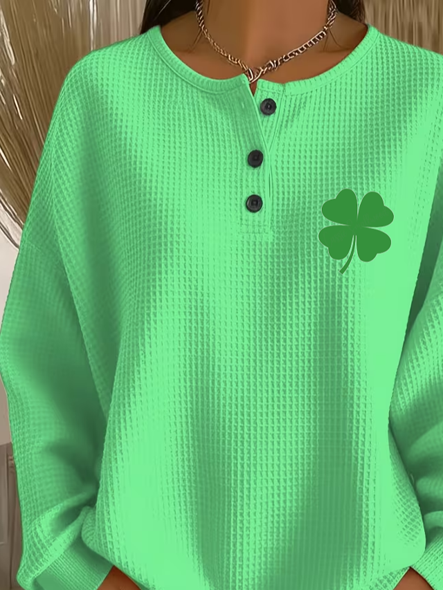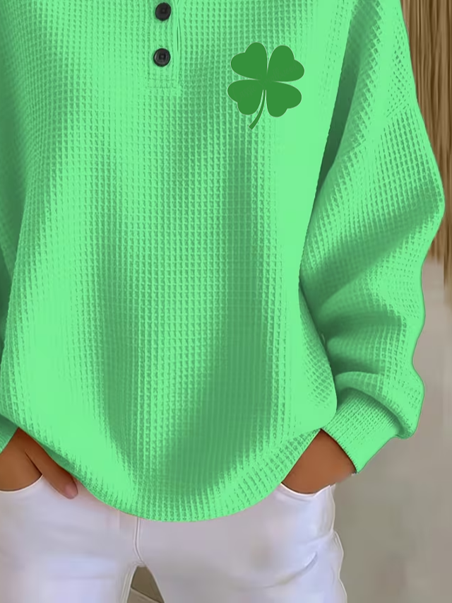Women's St. Patrick's Day Shamrock Print Button-Up Casual Waffle Knit Sweatshirt