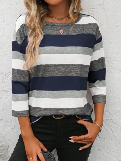 Women's Three Quarter Sleeve T-shirt Spring/Fall As Picture Striped Crew Neck Daily Going Out Casual Top