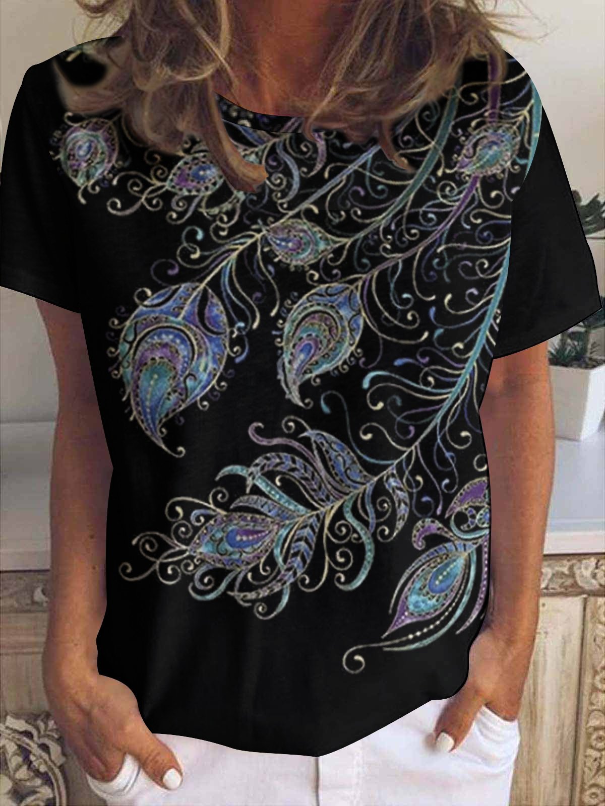 Women's Peacock Feathers Print Crew Neck T-Shirt