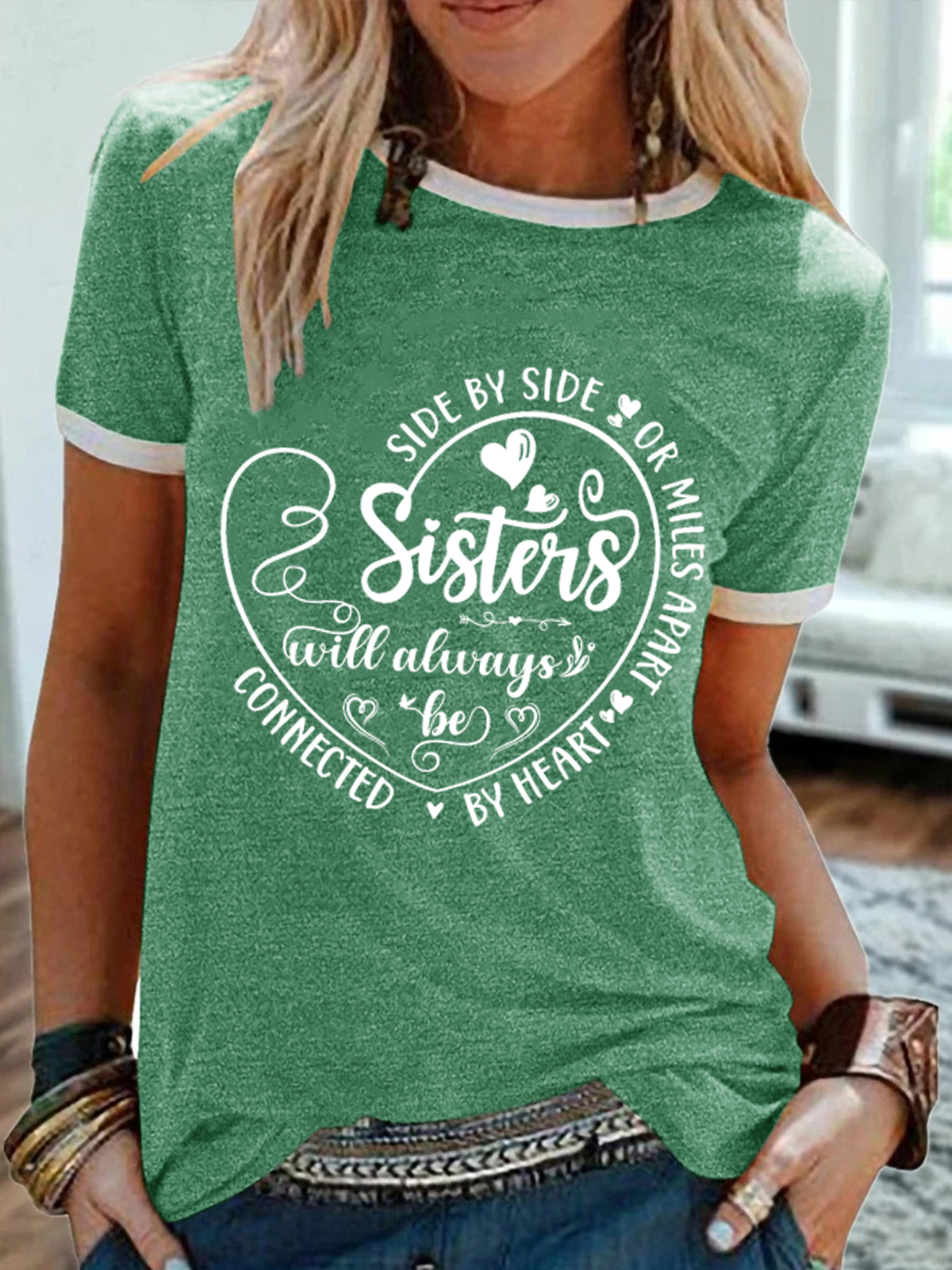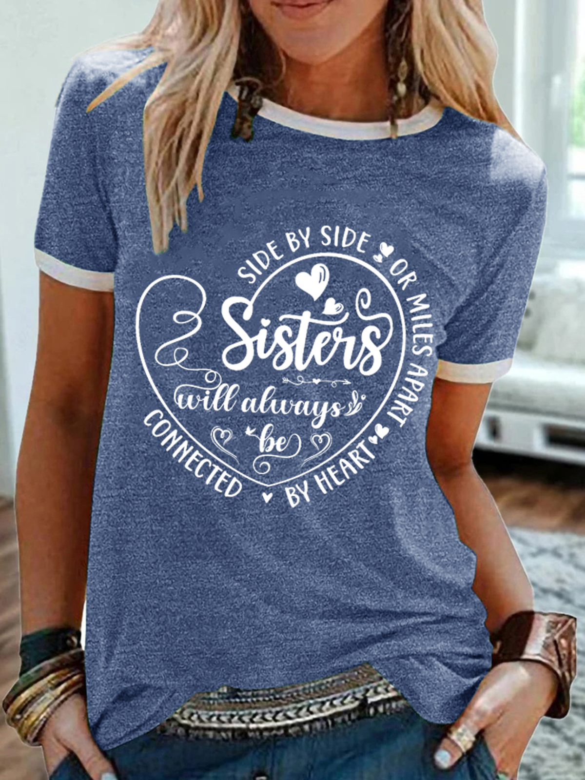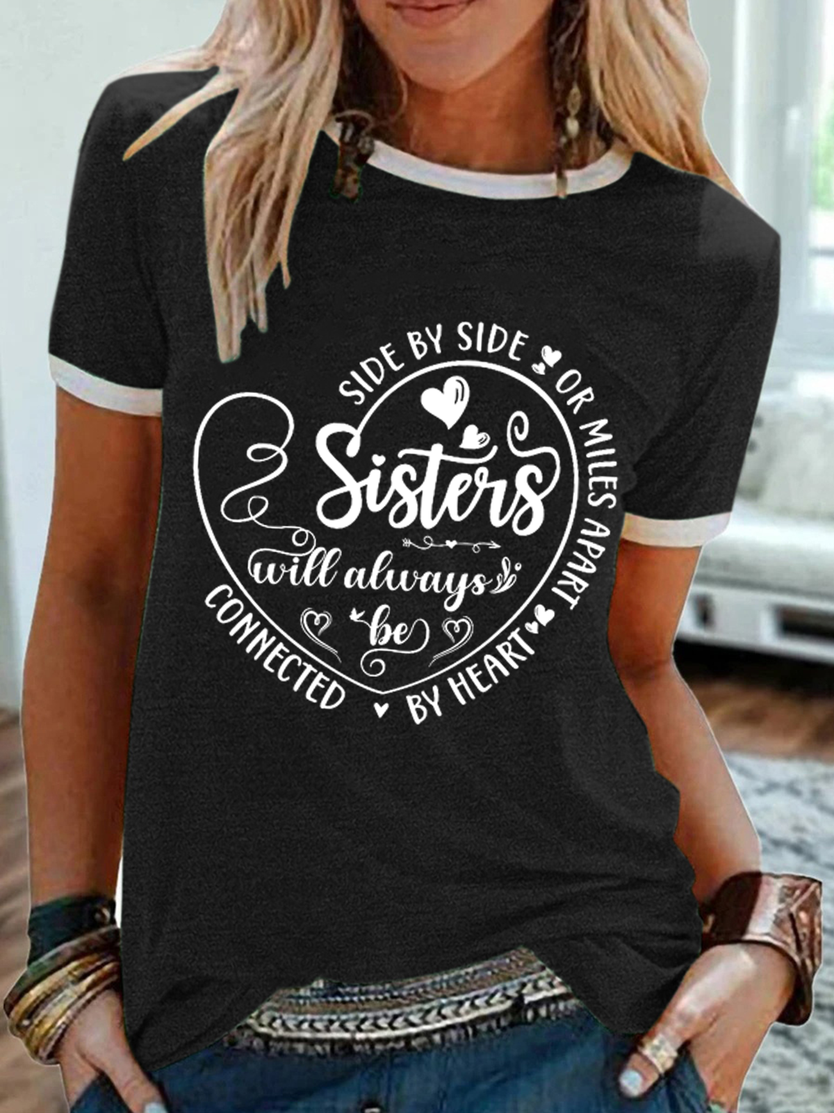 Women's Side By Side Or Miles Apart Sisters Will Always Be Connected By Heart Cotton-Blend T-Shirt