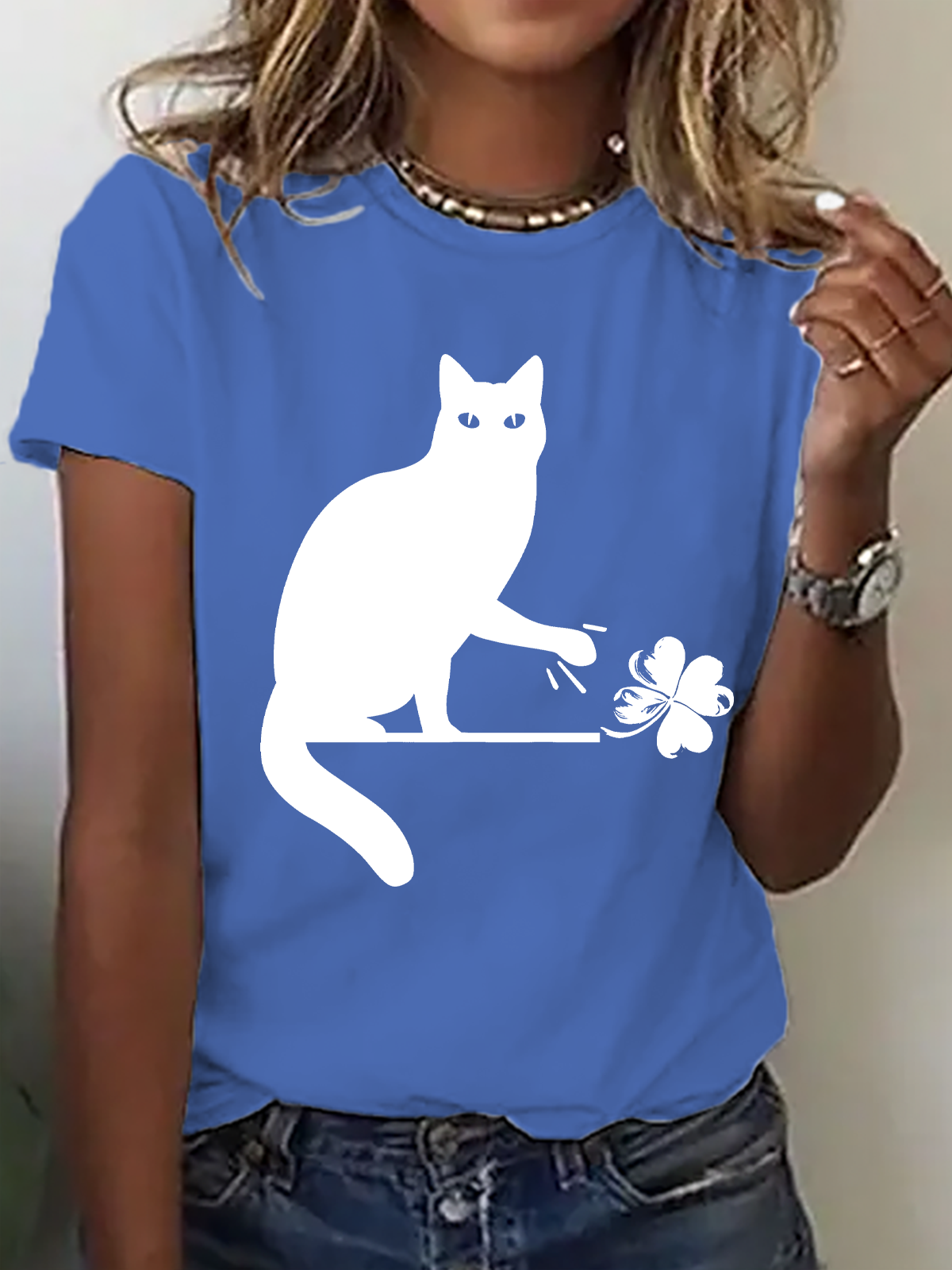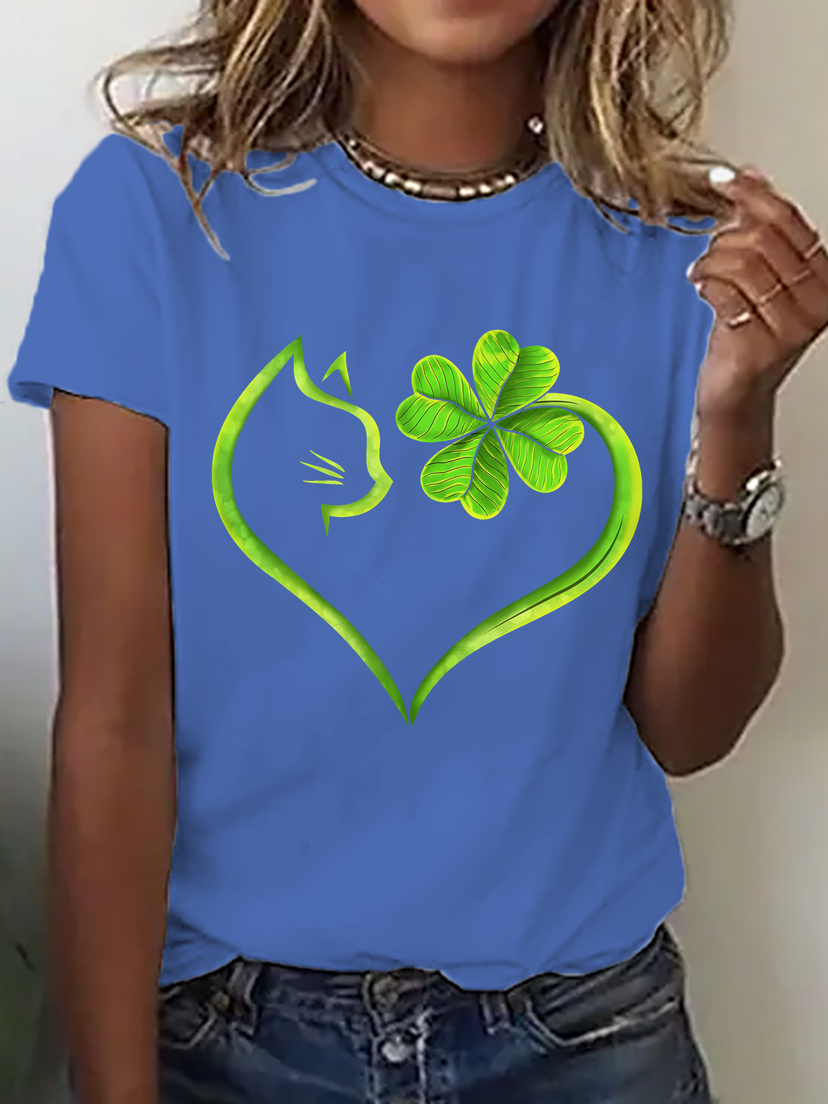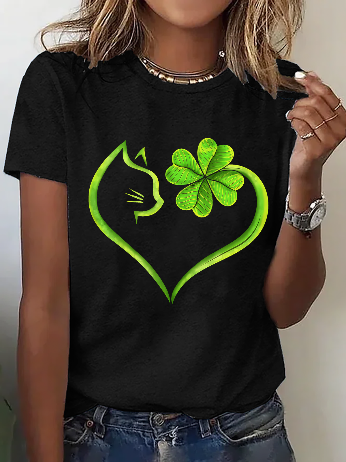 Cat On Four Leaf Clover Heart Cotton T-Shirt