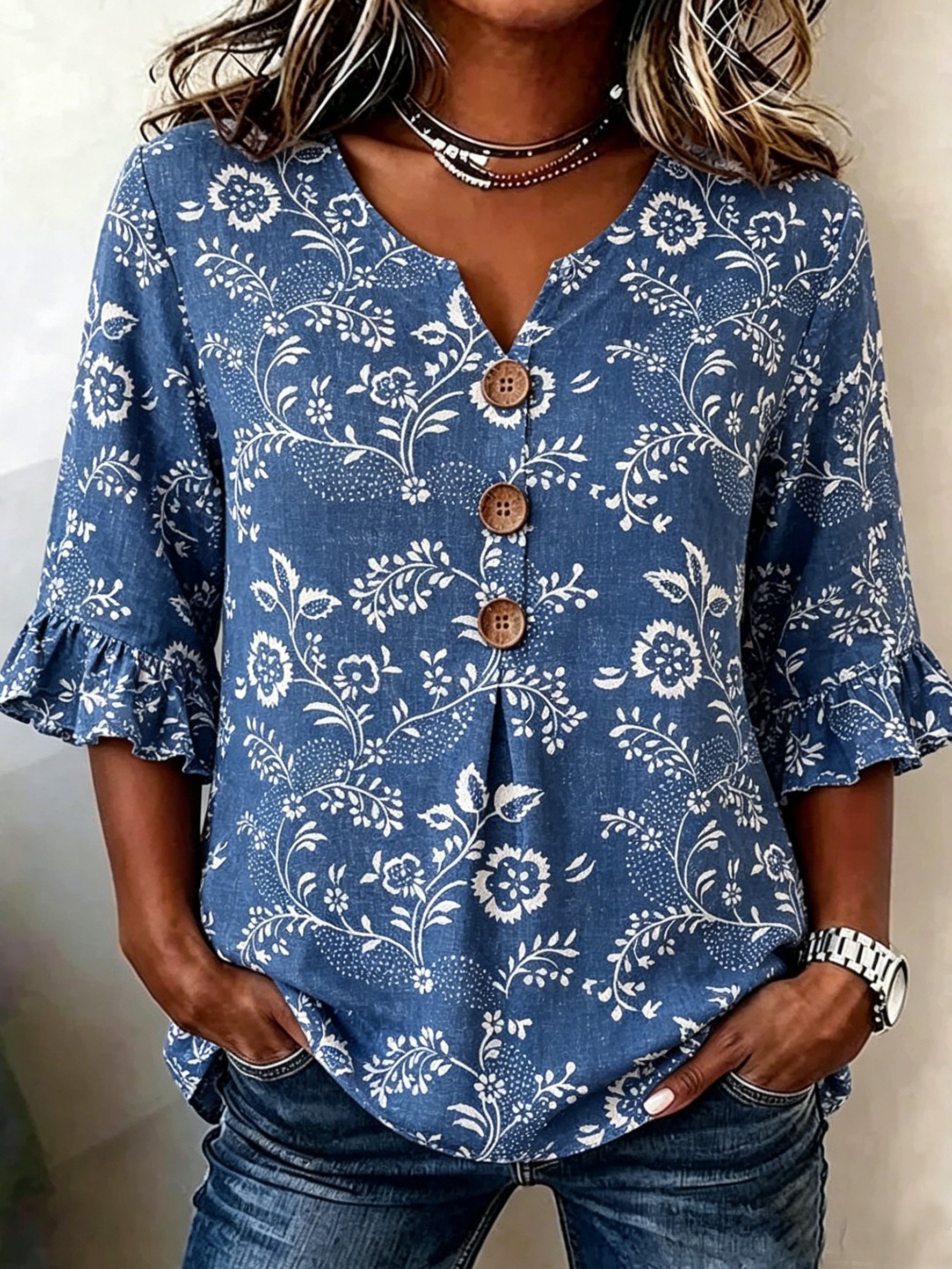Cotton And Linen The Quarter Sleeve Ruffle V Neck Casual Blouse