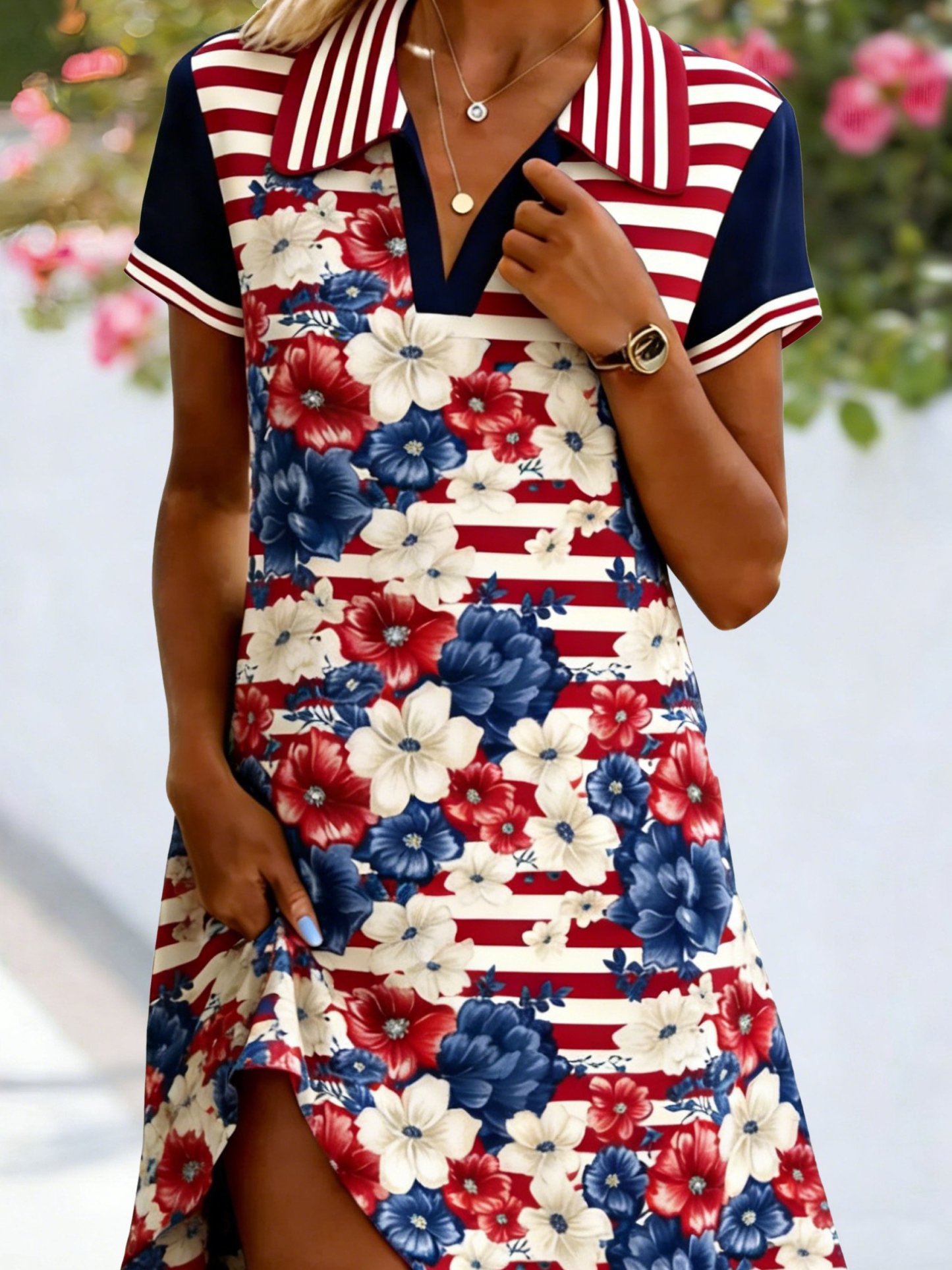 3D Printing Floral Pattern Short Sleeve V Nek America Flag Summer Casual Shirt Dress