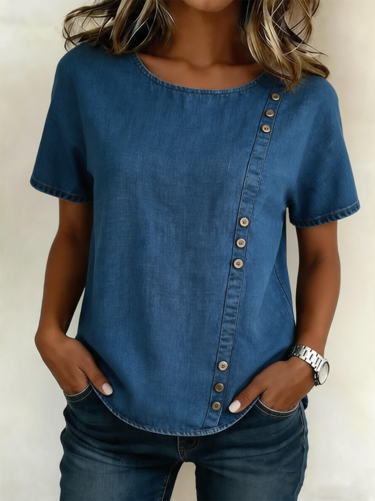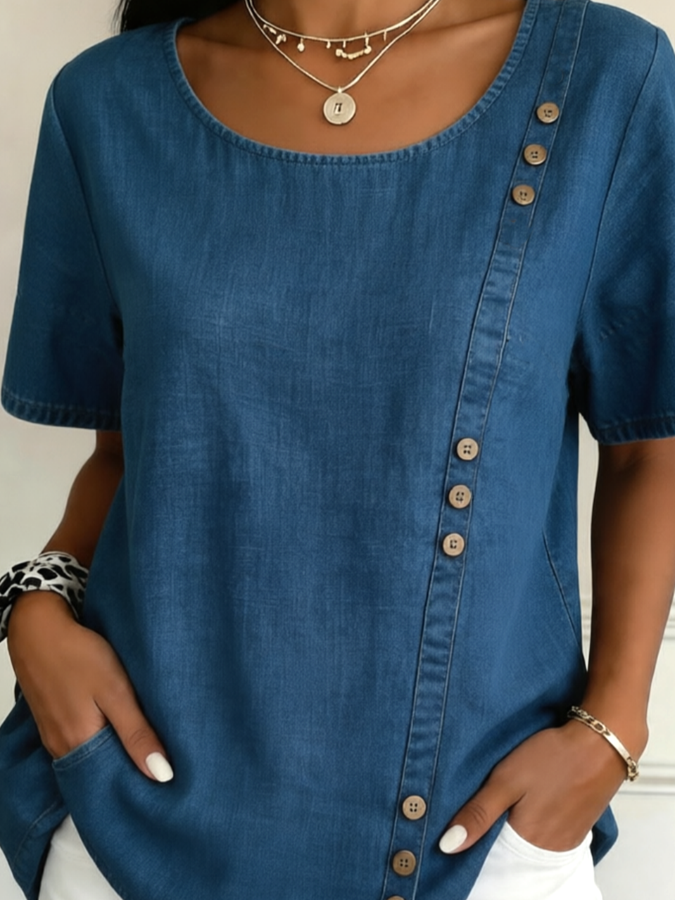 Crew Neck Faux Denim Print Graphic Casual Linen Blend Shirt