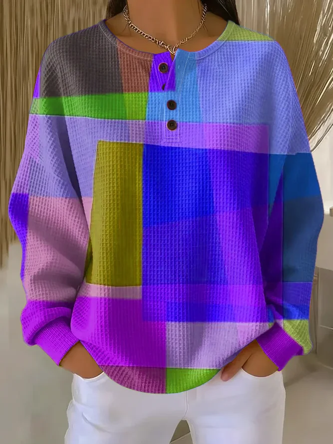 Women's Abstract Print Button-Up Casual Waffle Knit Sweatshirt