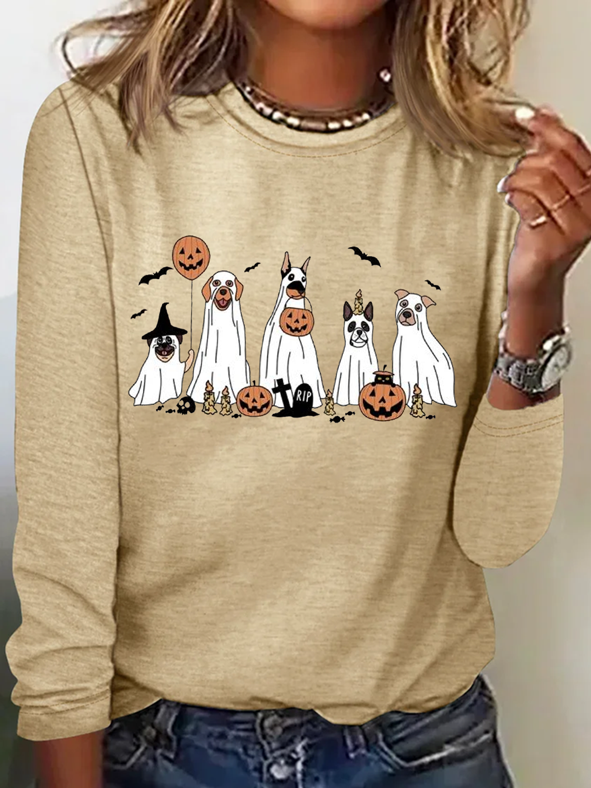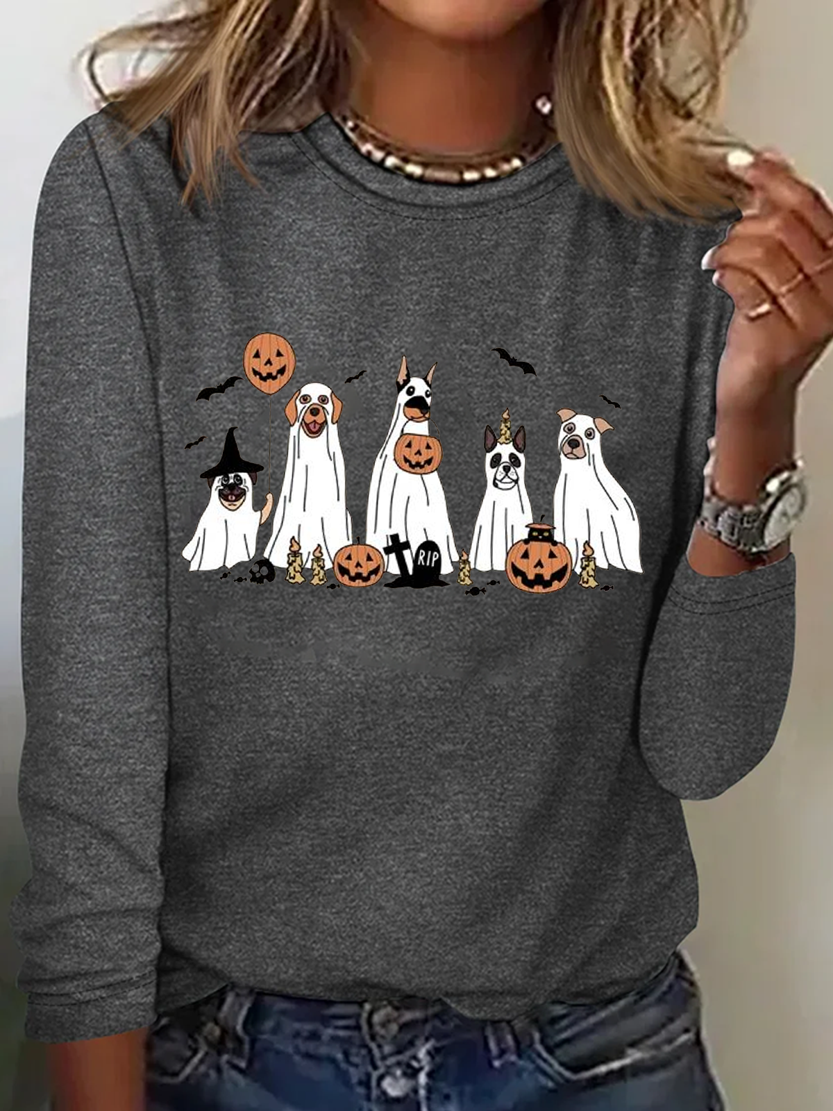 Holiday Round Neck Long Sleeve Halloween Letter Print T-Shirt