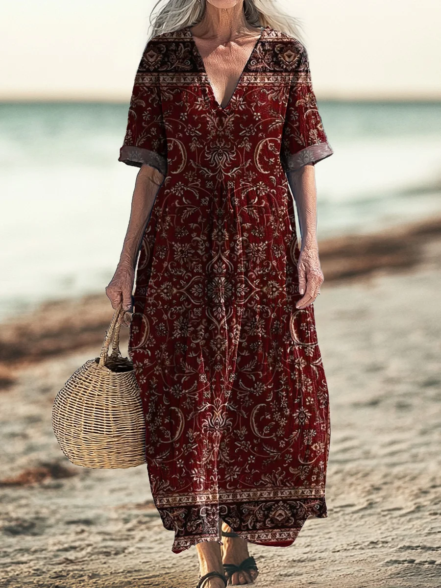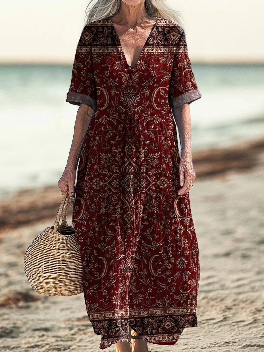 Women's retro ethnic totem art print pocket V-neck dress
