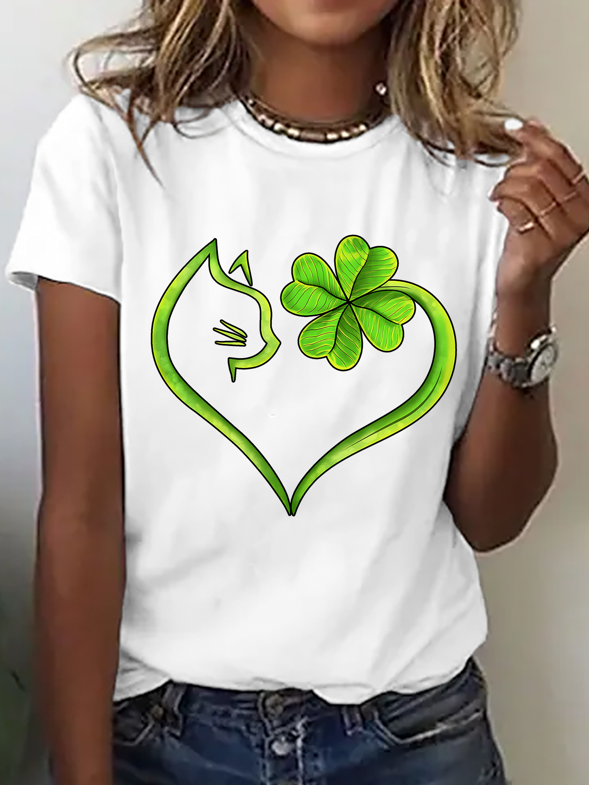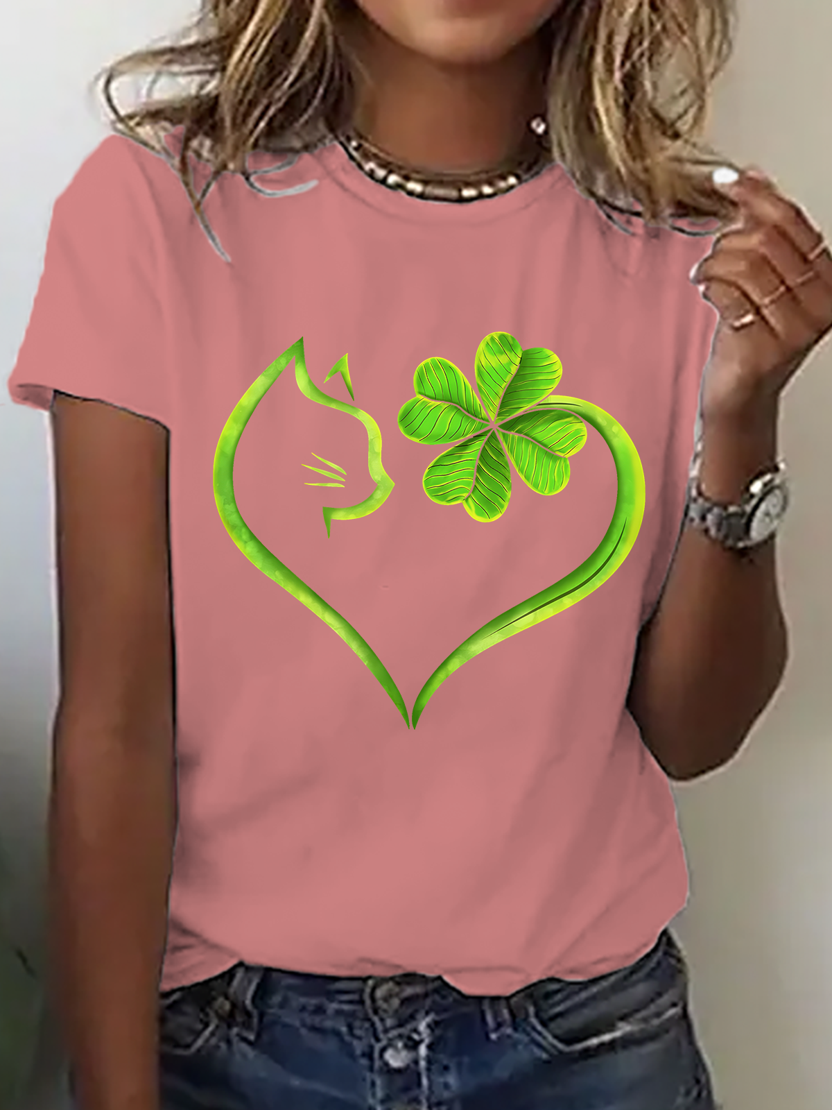 Cat On Four Leaf Clover Heart Cotton T-Shirt