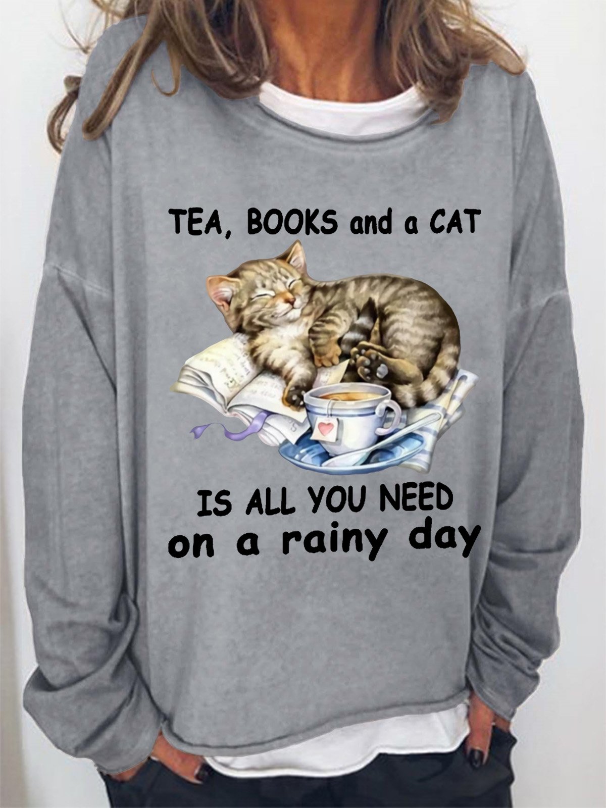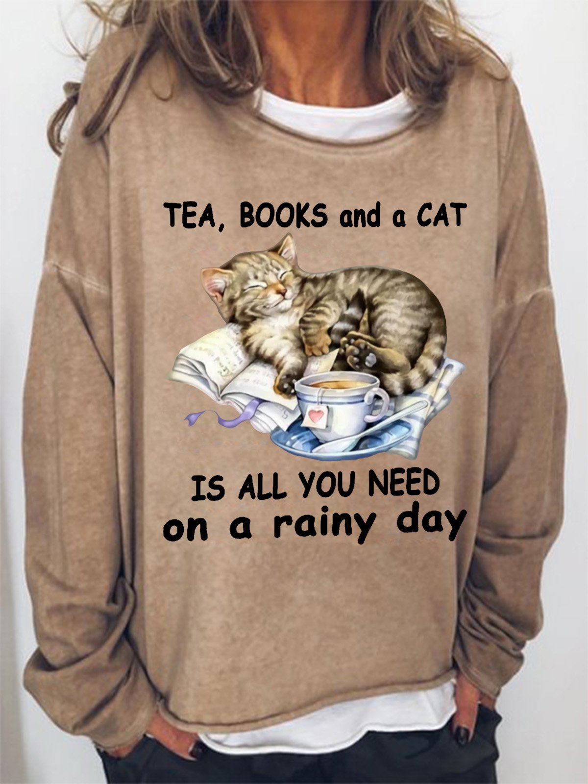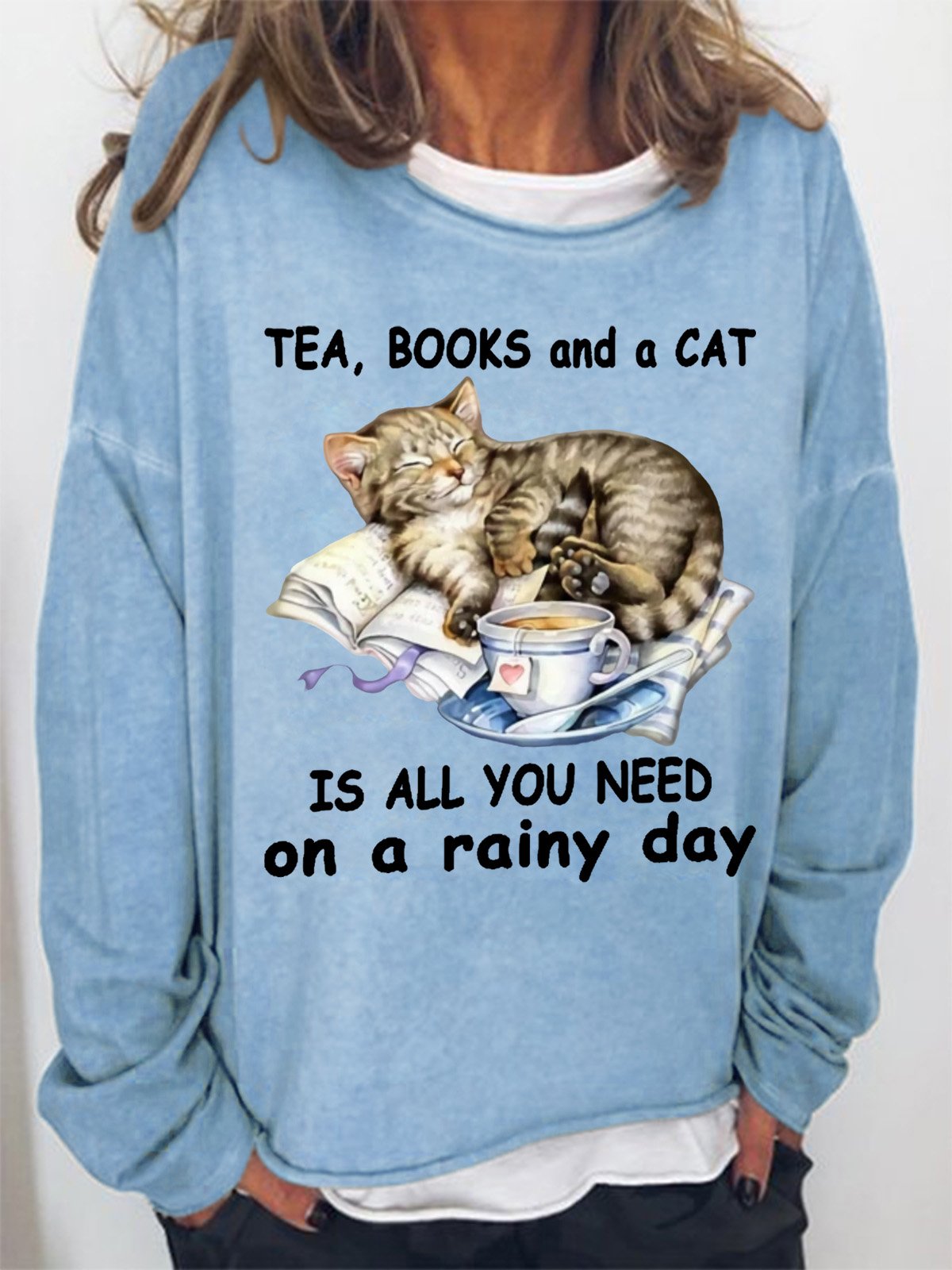 Tea Books And A Cat Is All You Need On A Rainy Day Womens Sweatshirt