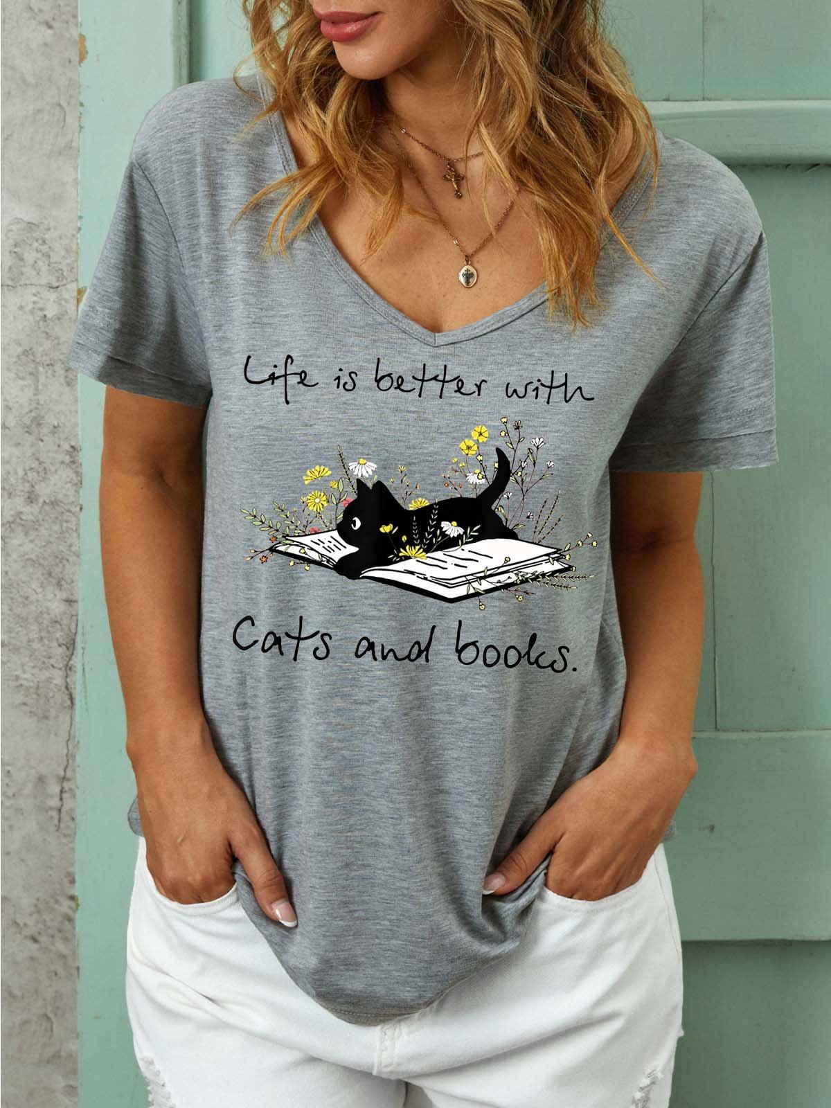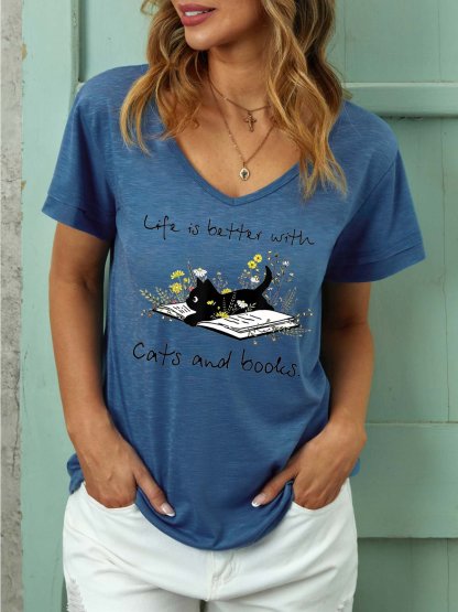 Women Books And Cats Life Better Cat Casual T-shirt