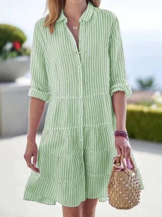 Women's Long Sleeve Spring/Fall Pink Striped Split Joint Shawl Collar Daily Going Out Vintage Midi A-Line Shirt Dress Dress