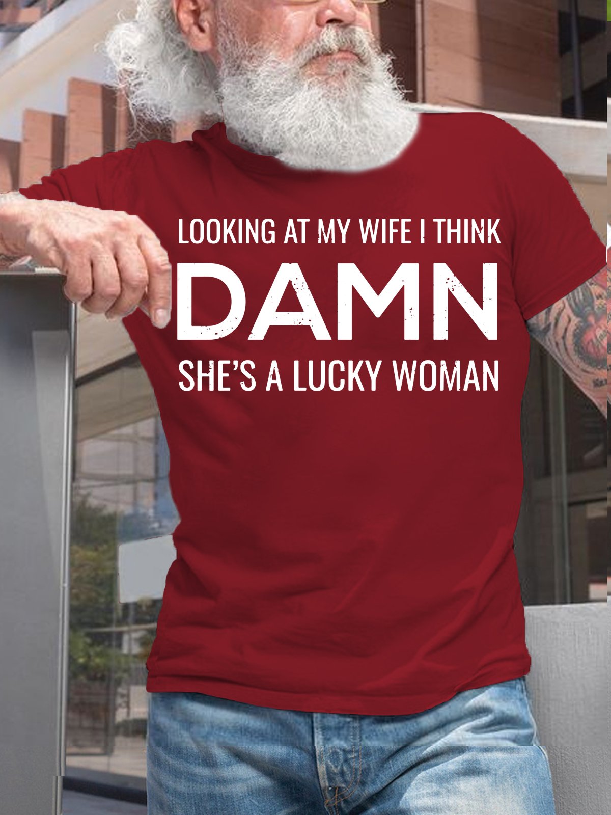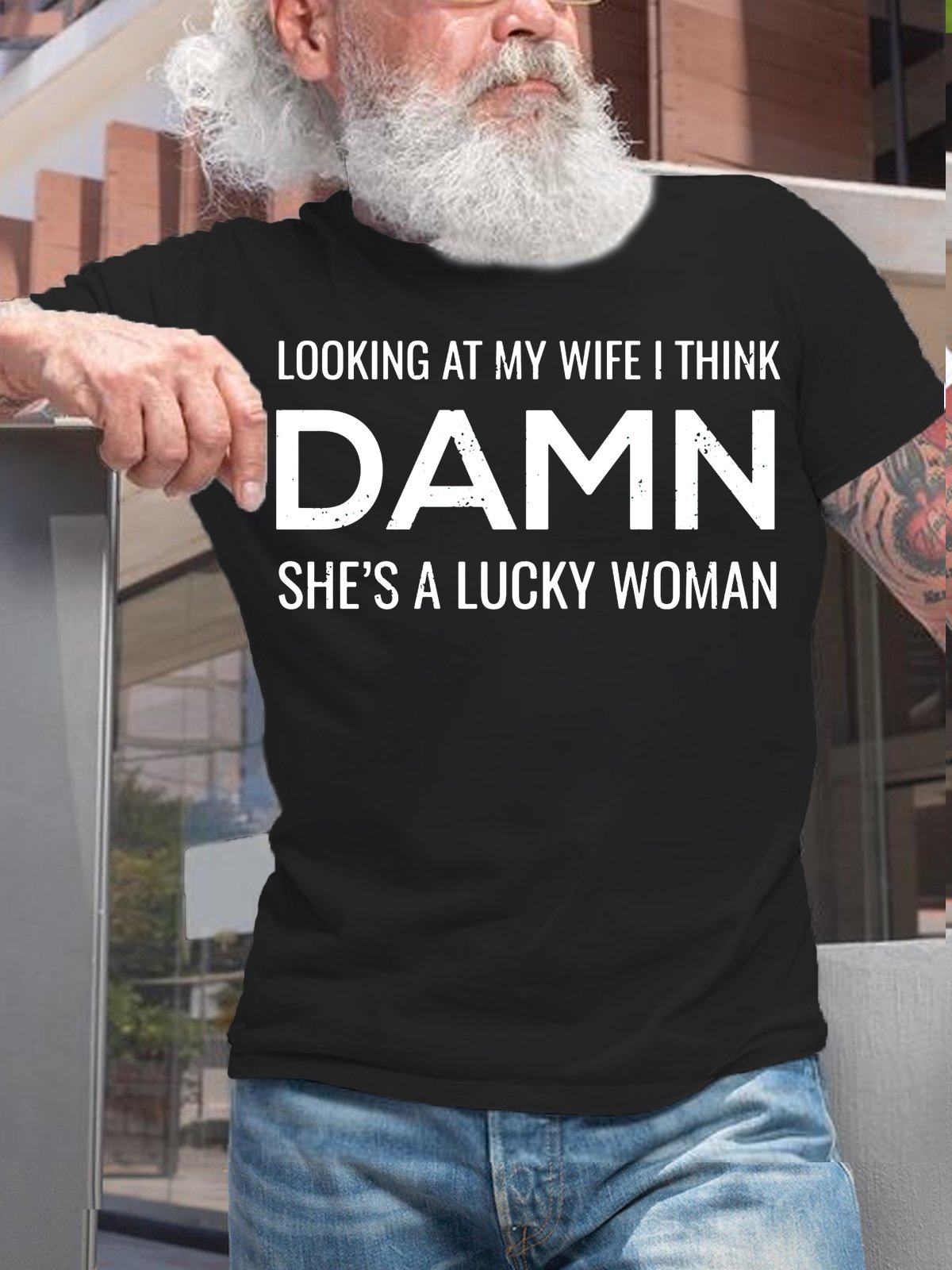 Mens Looking At My Wife I Think Damn She's A Lucky Woman Funny Letters Crew Neck T-Shirt
