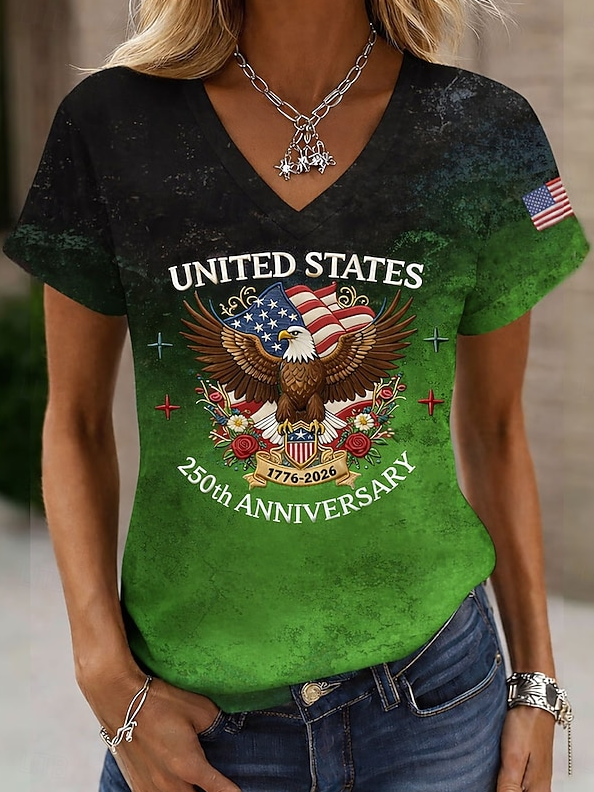 Women's Short Sleeve T-shirt Summer Blue America Flag Printing V Neck Holiday Going Out Vintage Top