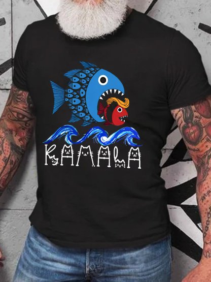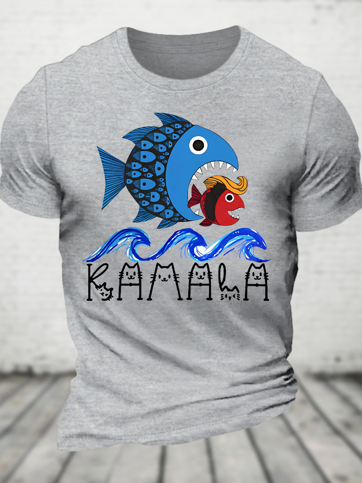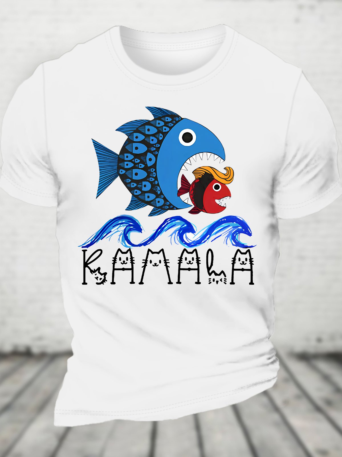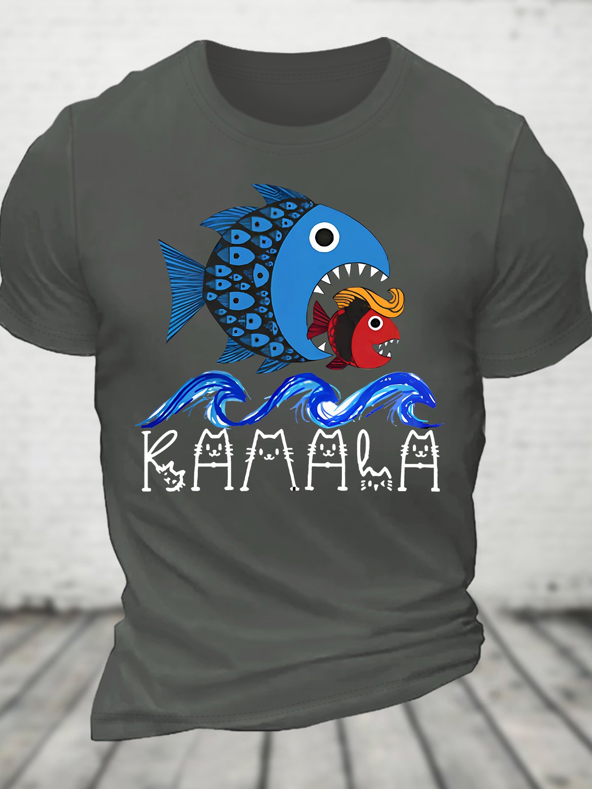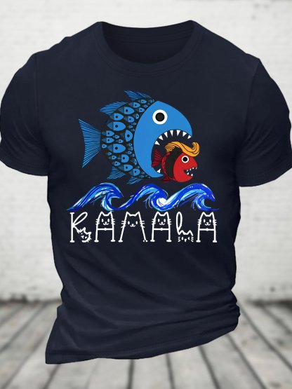 Blue Wave Big Fish Eats Small Fish Print Cotton T-shirt