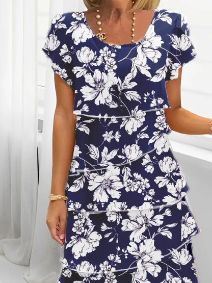 Floral Print Casual Crew Neck Short Sleeve Spring/Summer Chiffon Dress