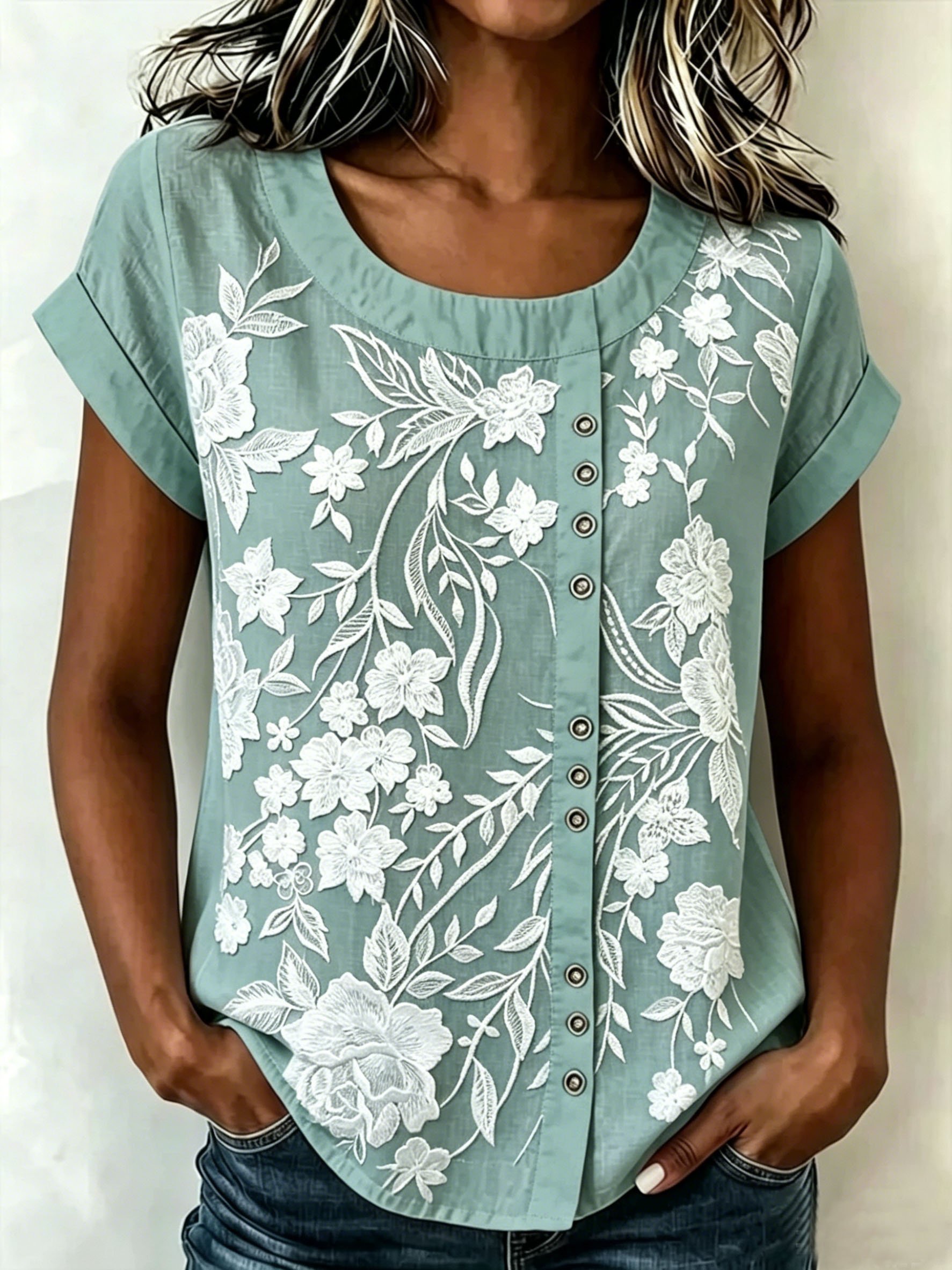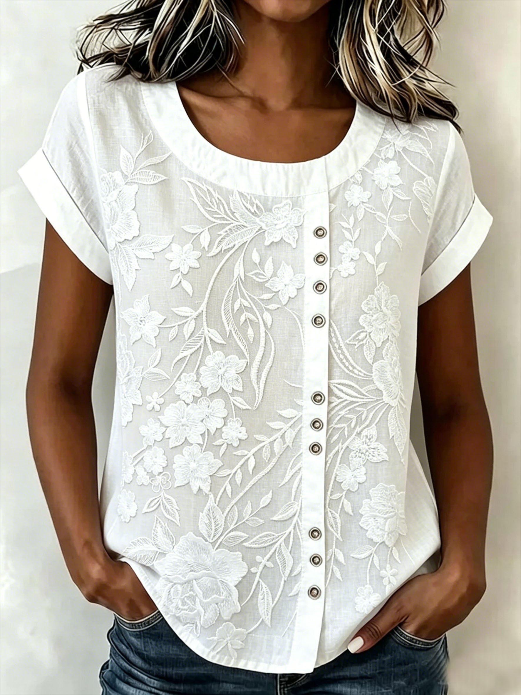 Round Neck Short Sleeve Embroidery Floral Summer Casual Top