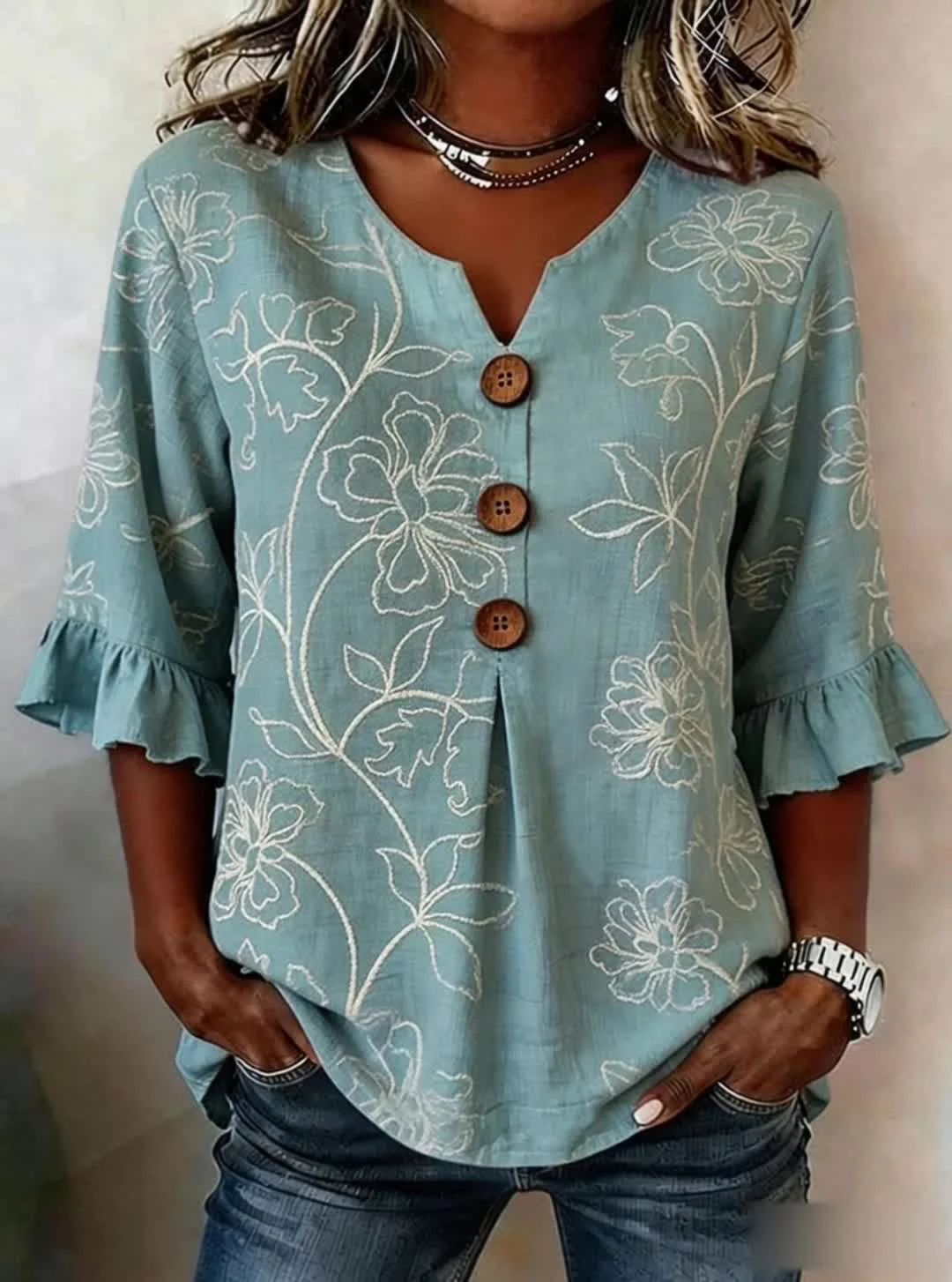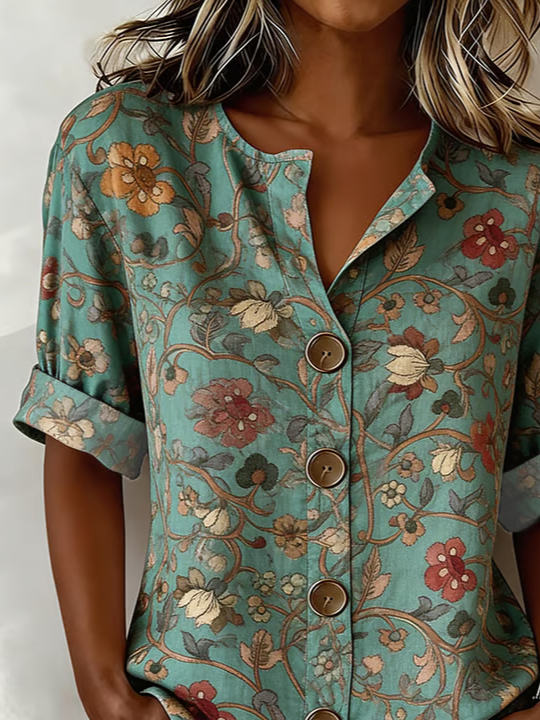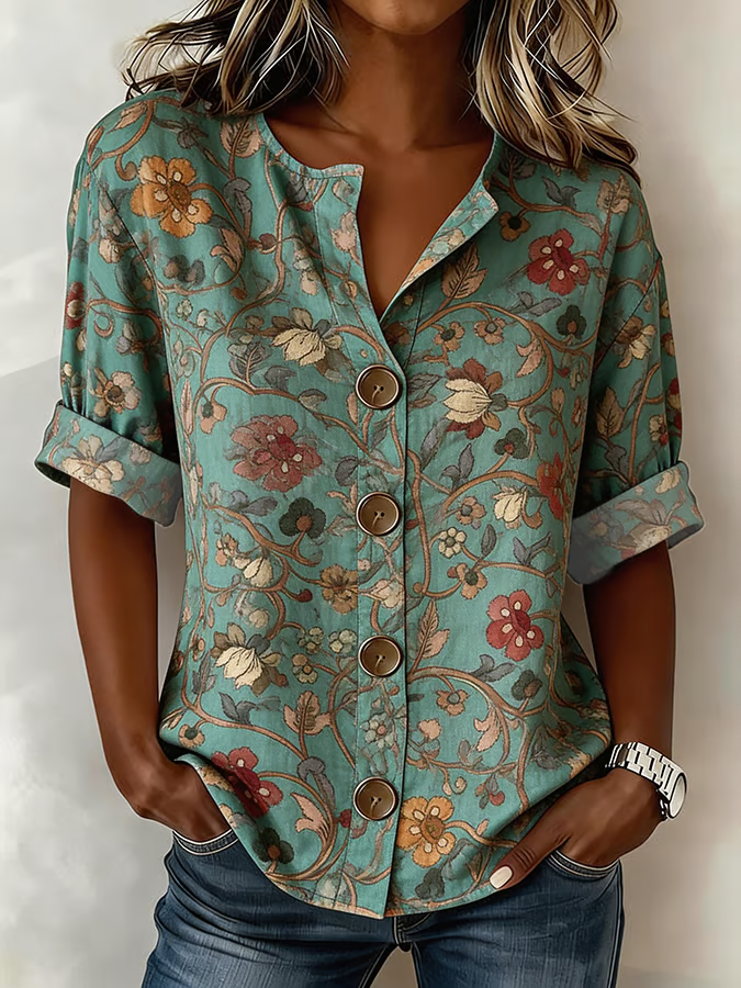 Vintage Cotton-Blend Botanical Pattern V Neck Shirt