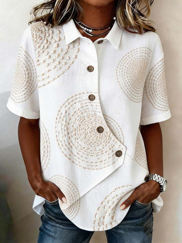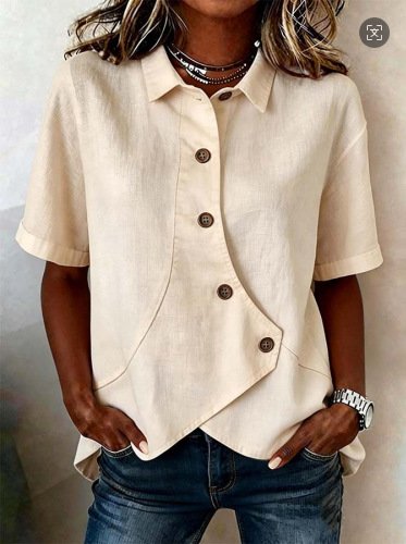 Cotton And Linen Shawl Collar Short Sleeve Asymmetry Placket Design Button Summer Going Out Casual Shirt
