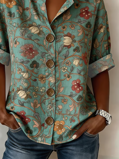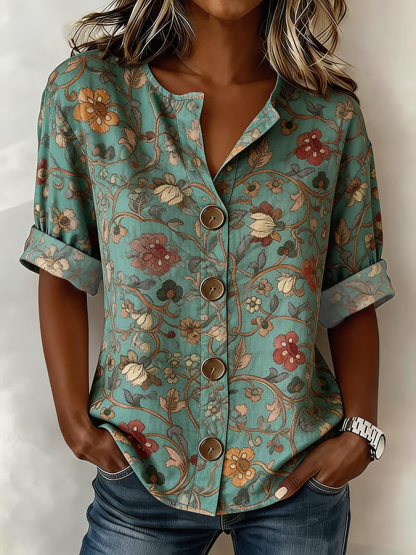 Women's Long Sleeve Shirt Spring/Fall Green Floral Buckle Stand Collar Daily Going Out Casual Top