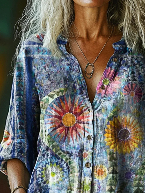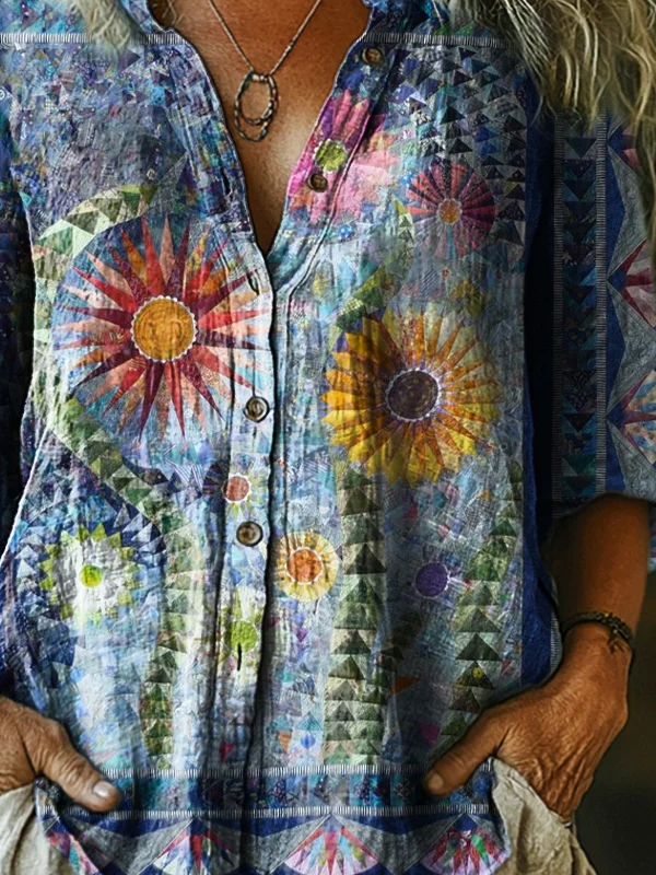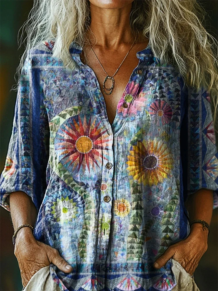 Women's Vintage Bohemian Floral Art Print Casual Cotton Linen Shirt