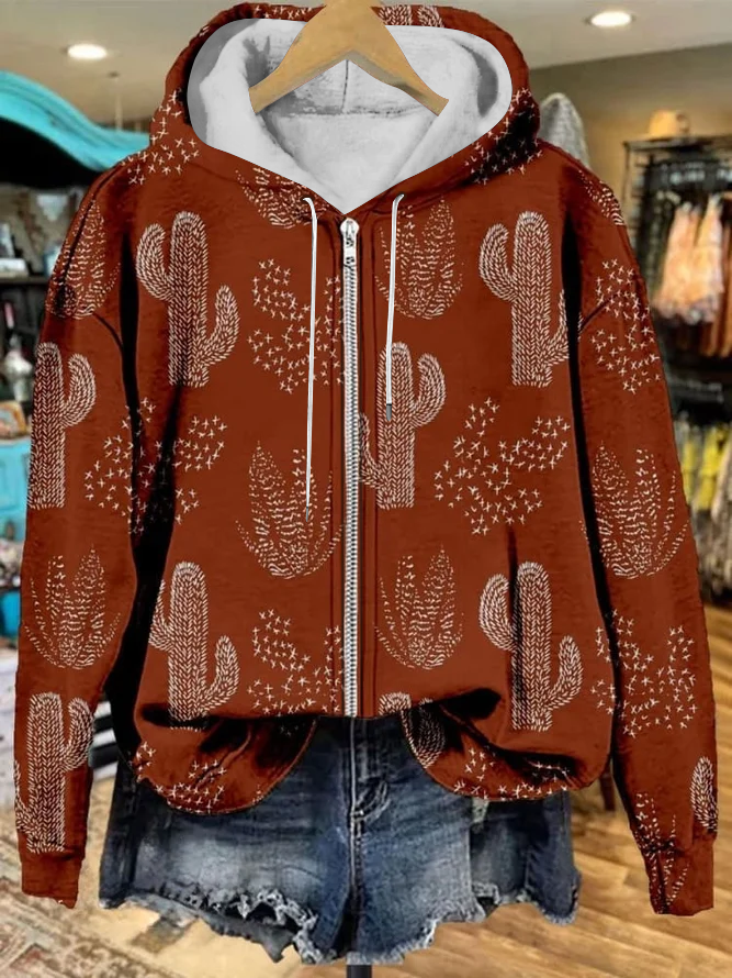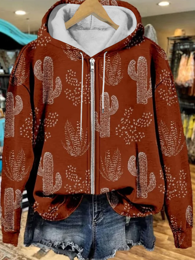 Women's Vintage Print Casual Zipper Sweatshirt Hoodie