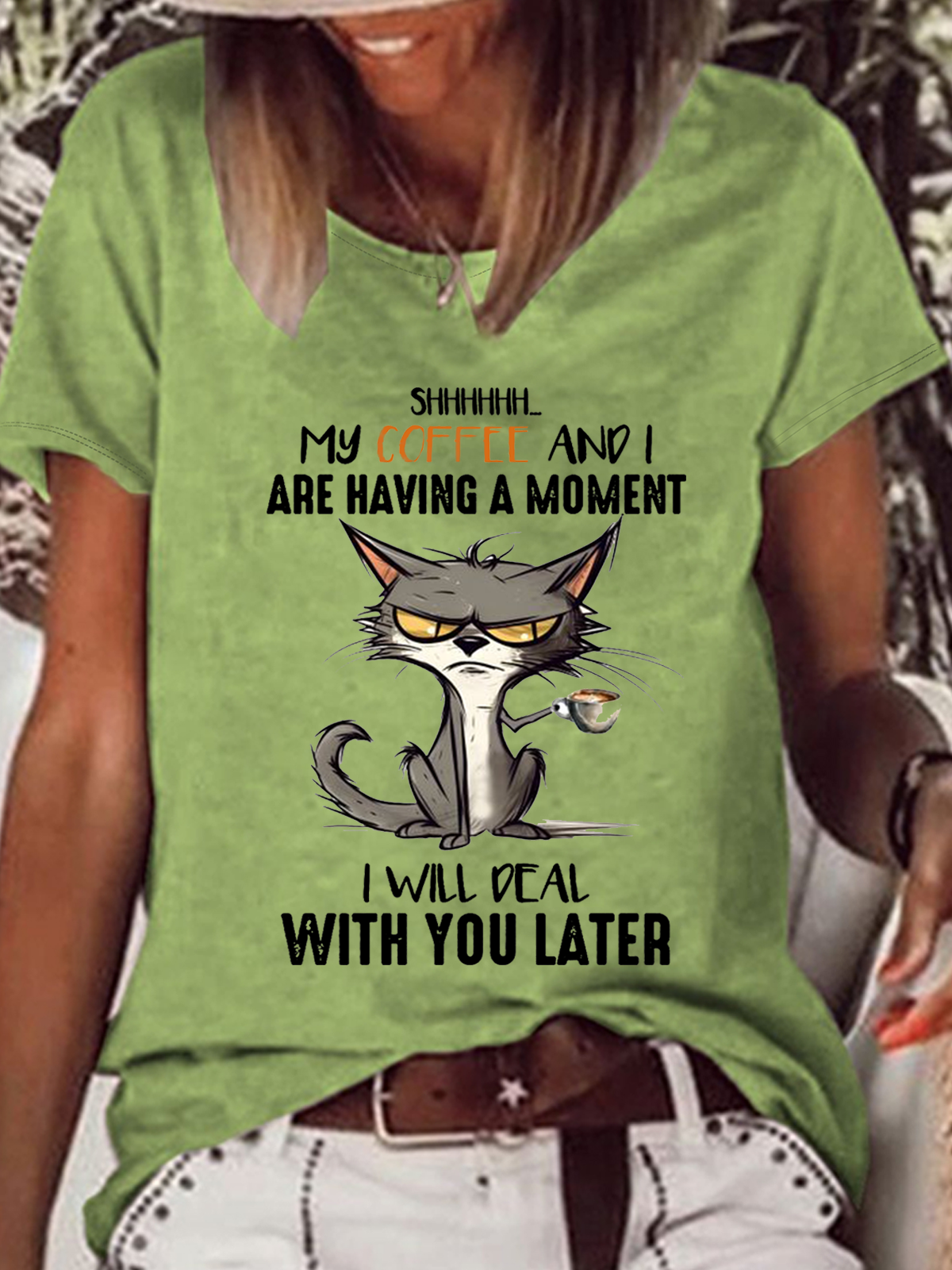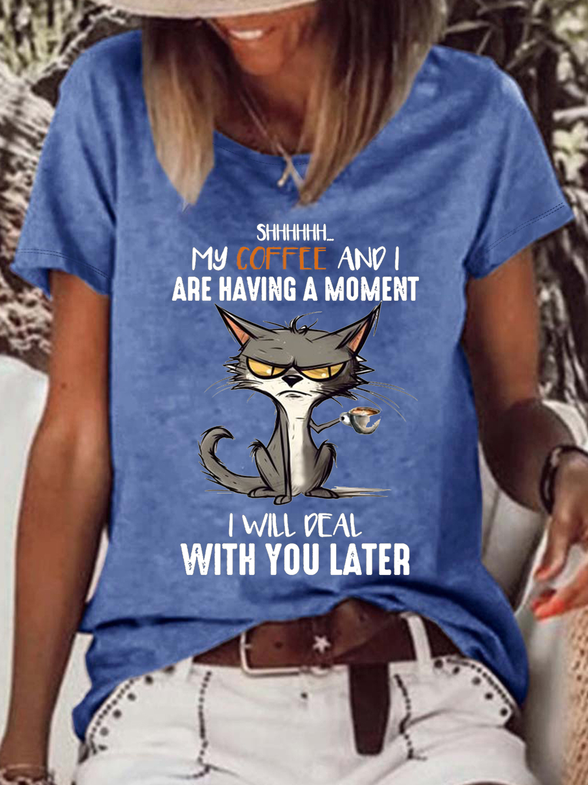 Women's Funny Cat Coffee Saying Coffee Lovers Casual Cat Loose T-Shirt