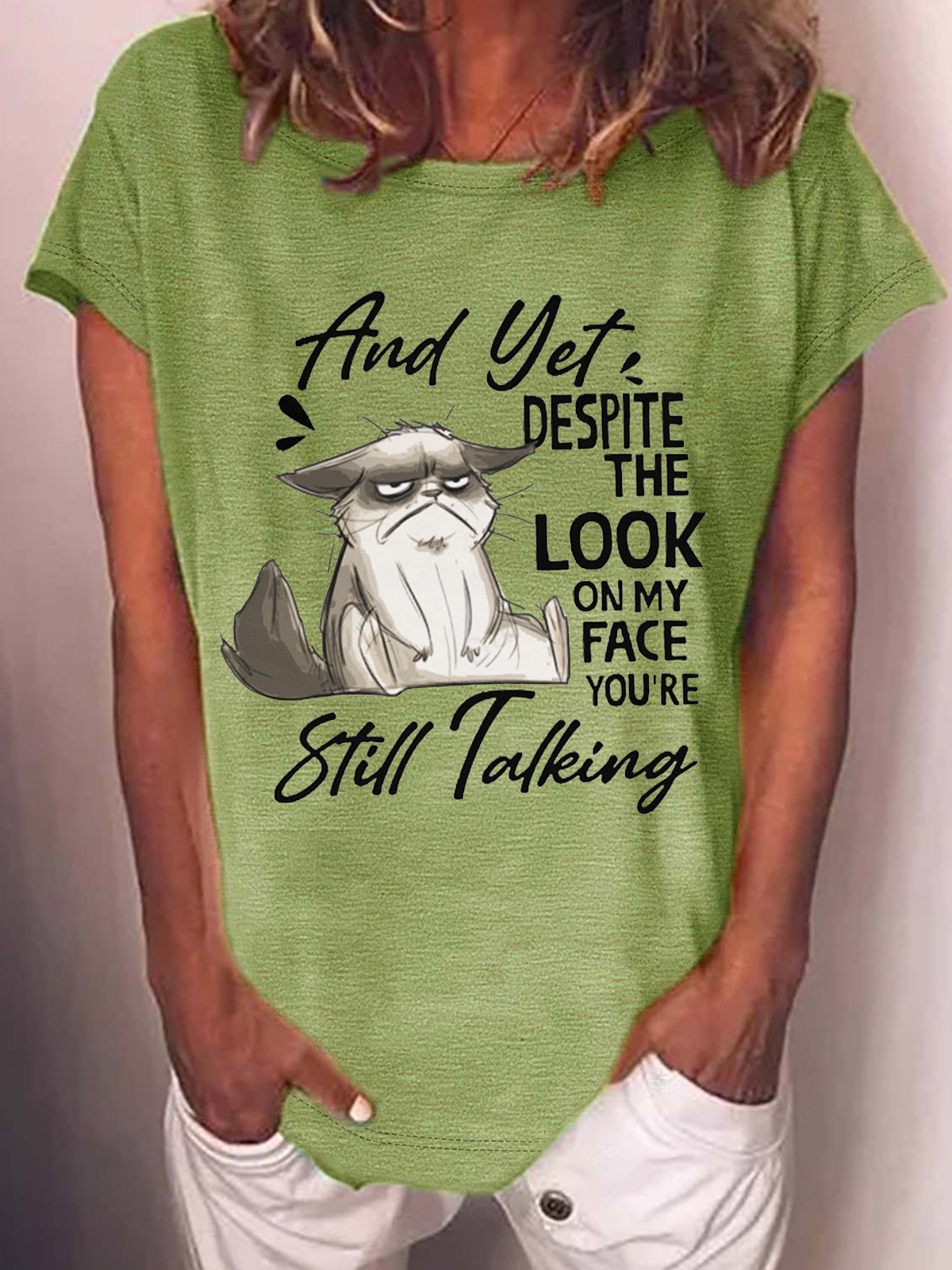 Women's Funny Cat Crew Neck Casual Text Letters Loose T-Shirt
