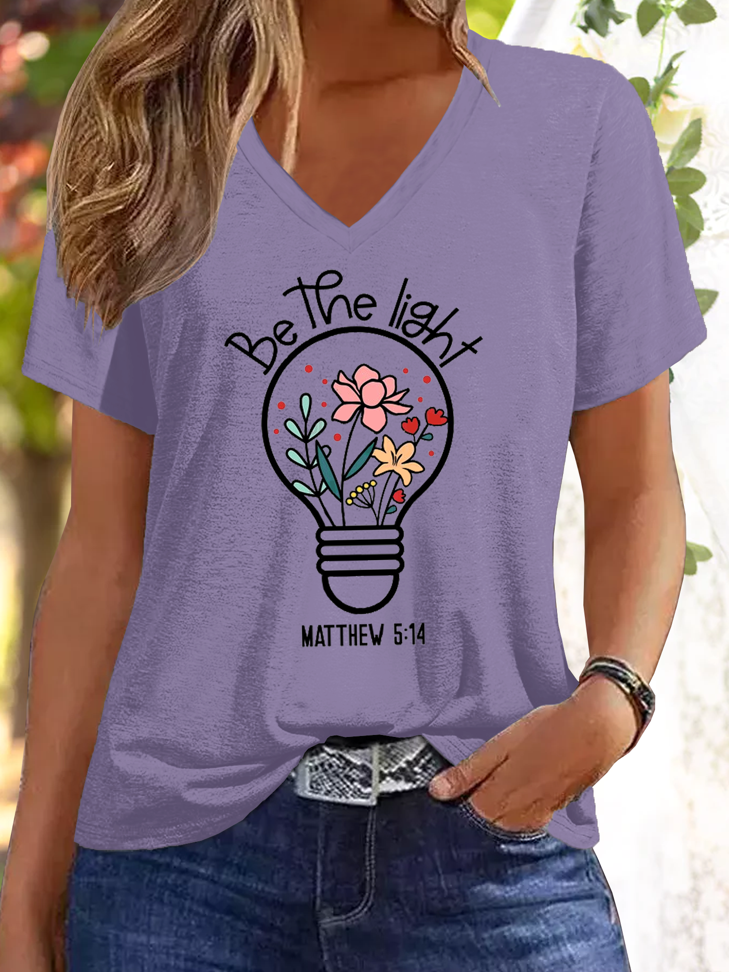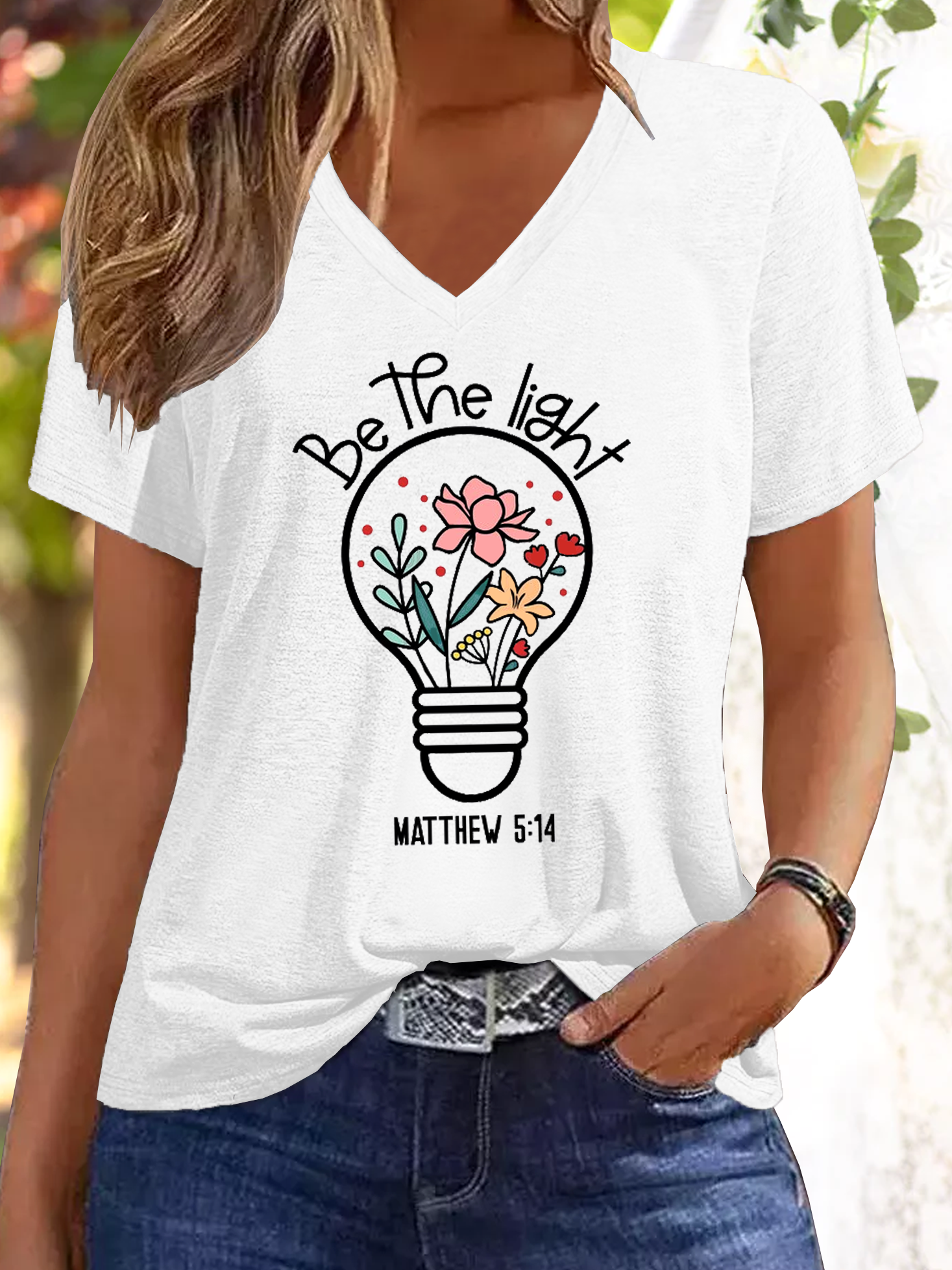 Women's Be The Light Christian Flowers V Neck Casual Cotton-Blend T-Shirt