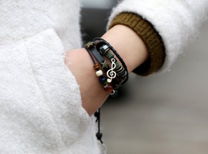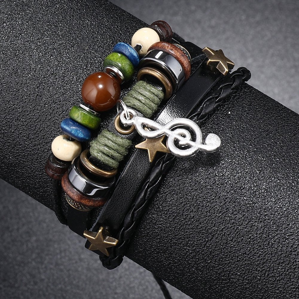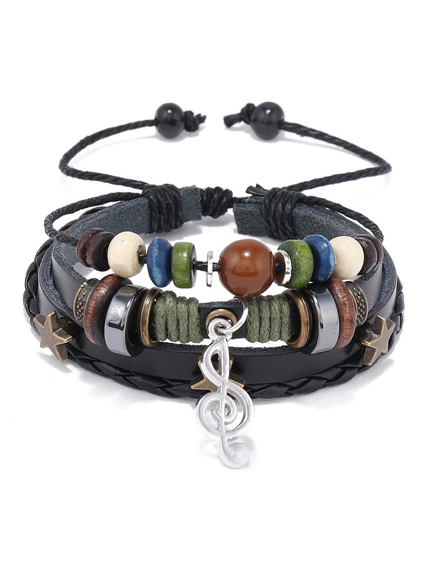 Multilayer Beaded Leather Adjustable Bracelet with Music Note Charm — Hand-Woven Music Festival Accessory