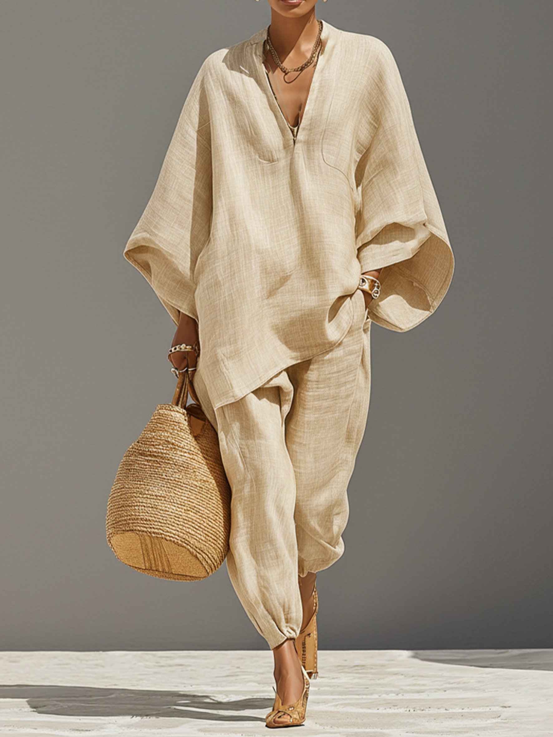 Plain V Neck Short Sleeve Top With Pants Spring Casual Two-Piece Set
