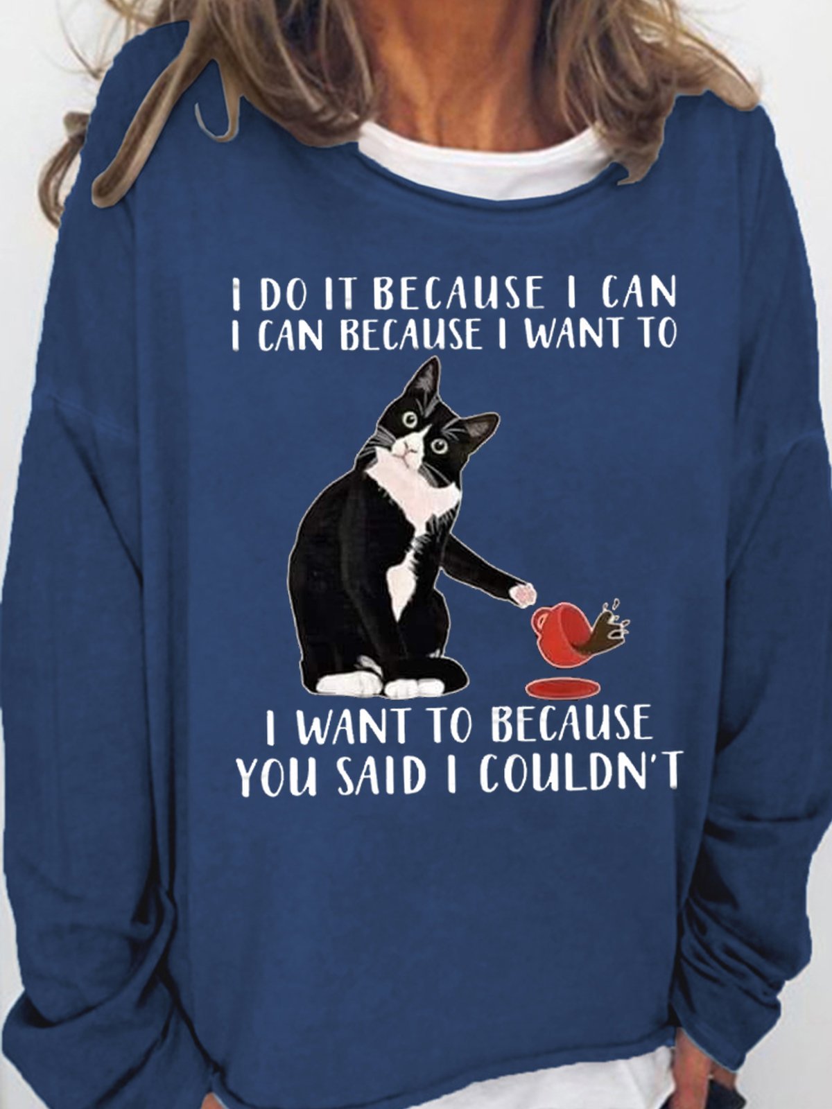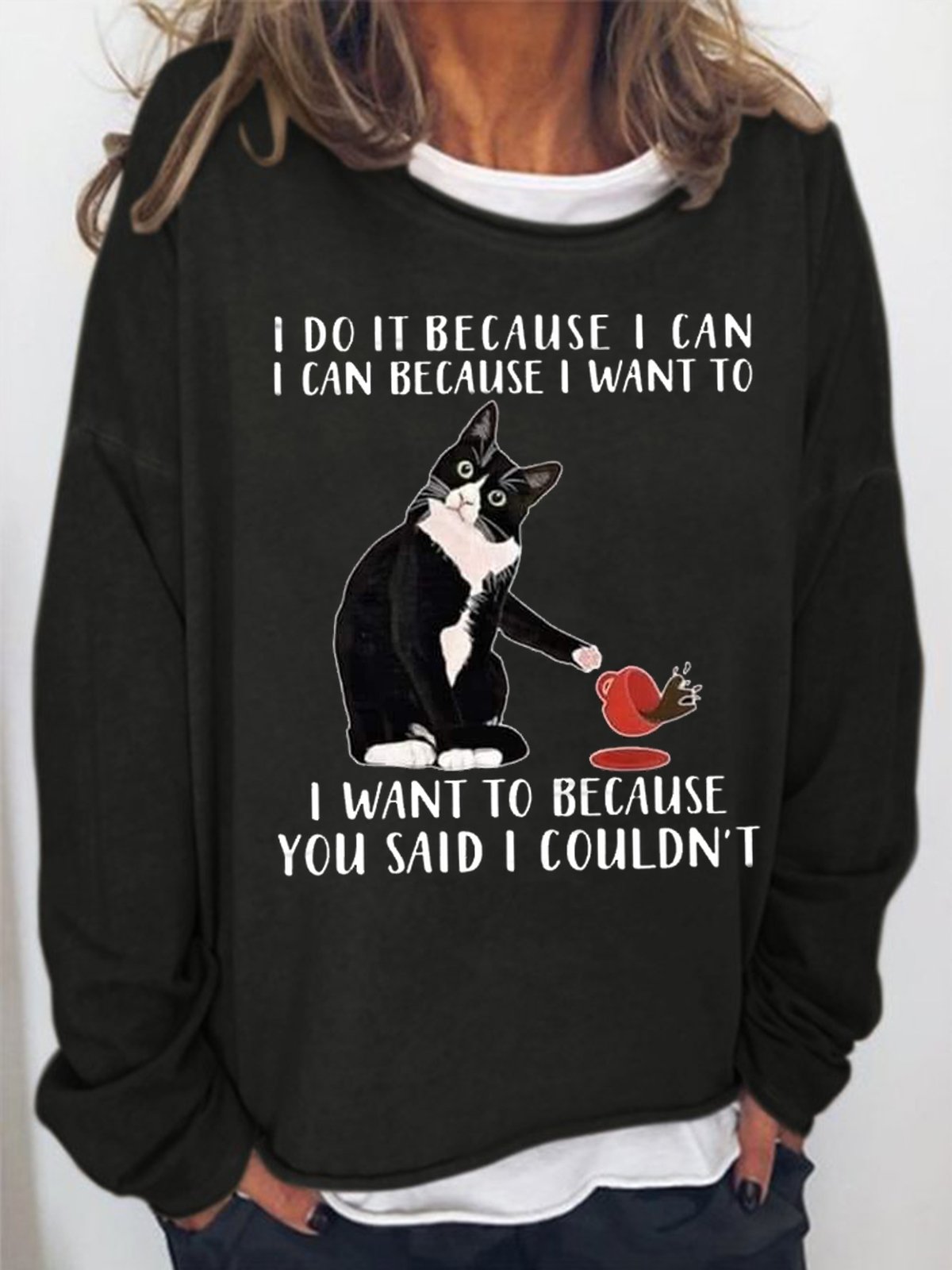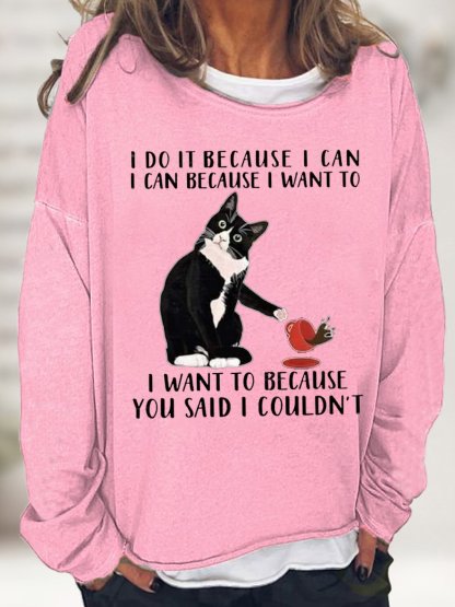 Women's I Do It Because I Can I Can Because I Want Funny Graphic Print Black Cat Loose Casual Text Letters Sweatshirt