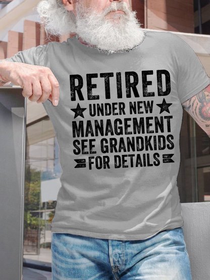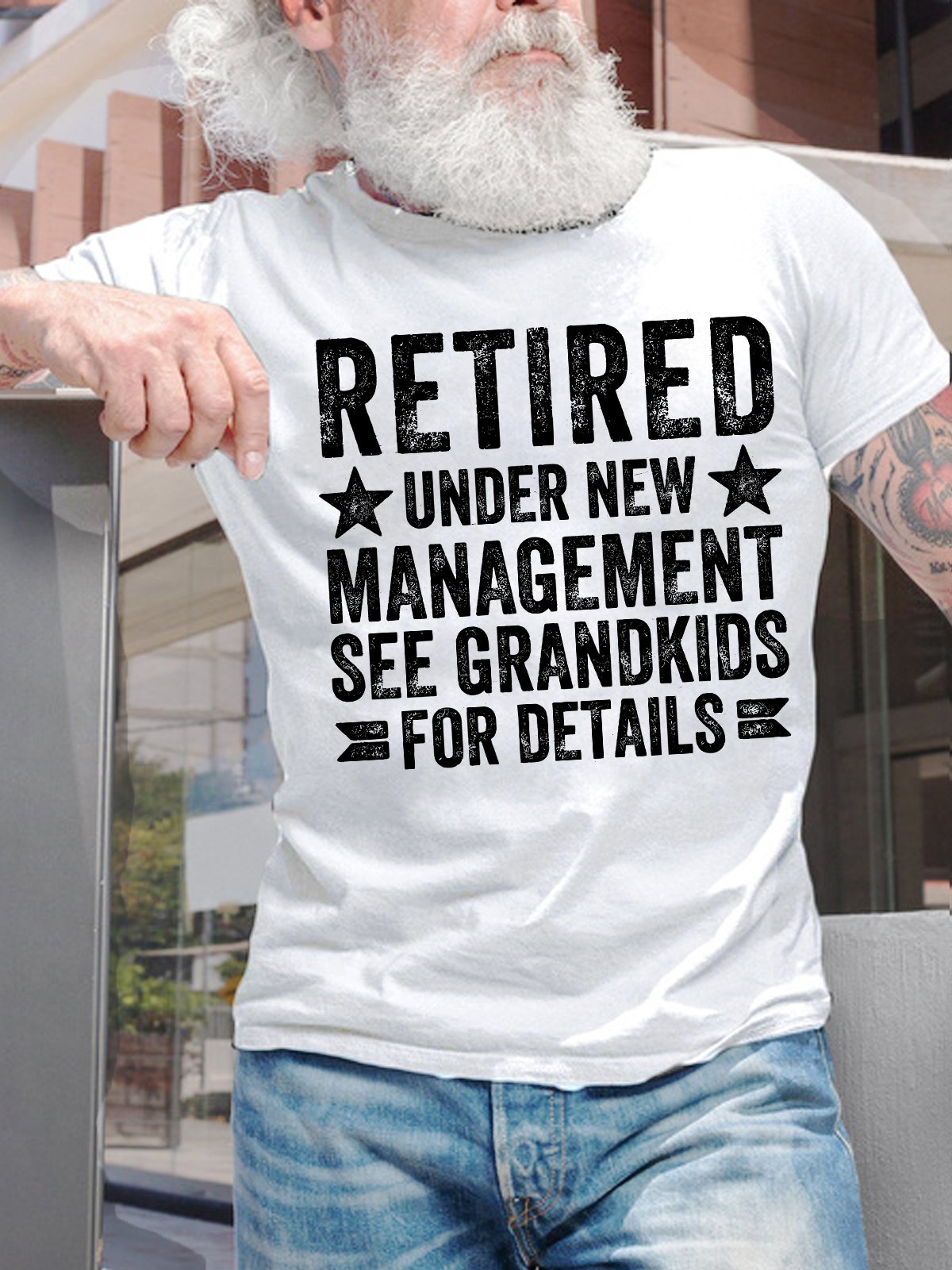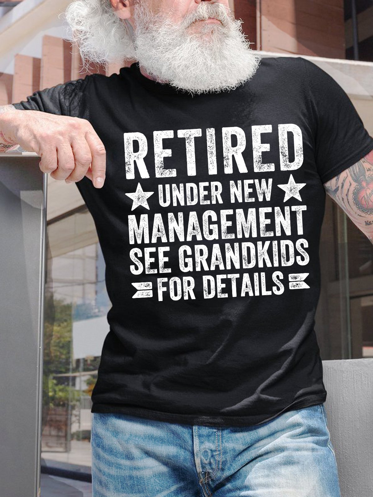 Men's Retired Under New Management See Grandkids For Details Funny Graphic Print Cotton Text Letters Casual T-Shirt