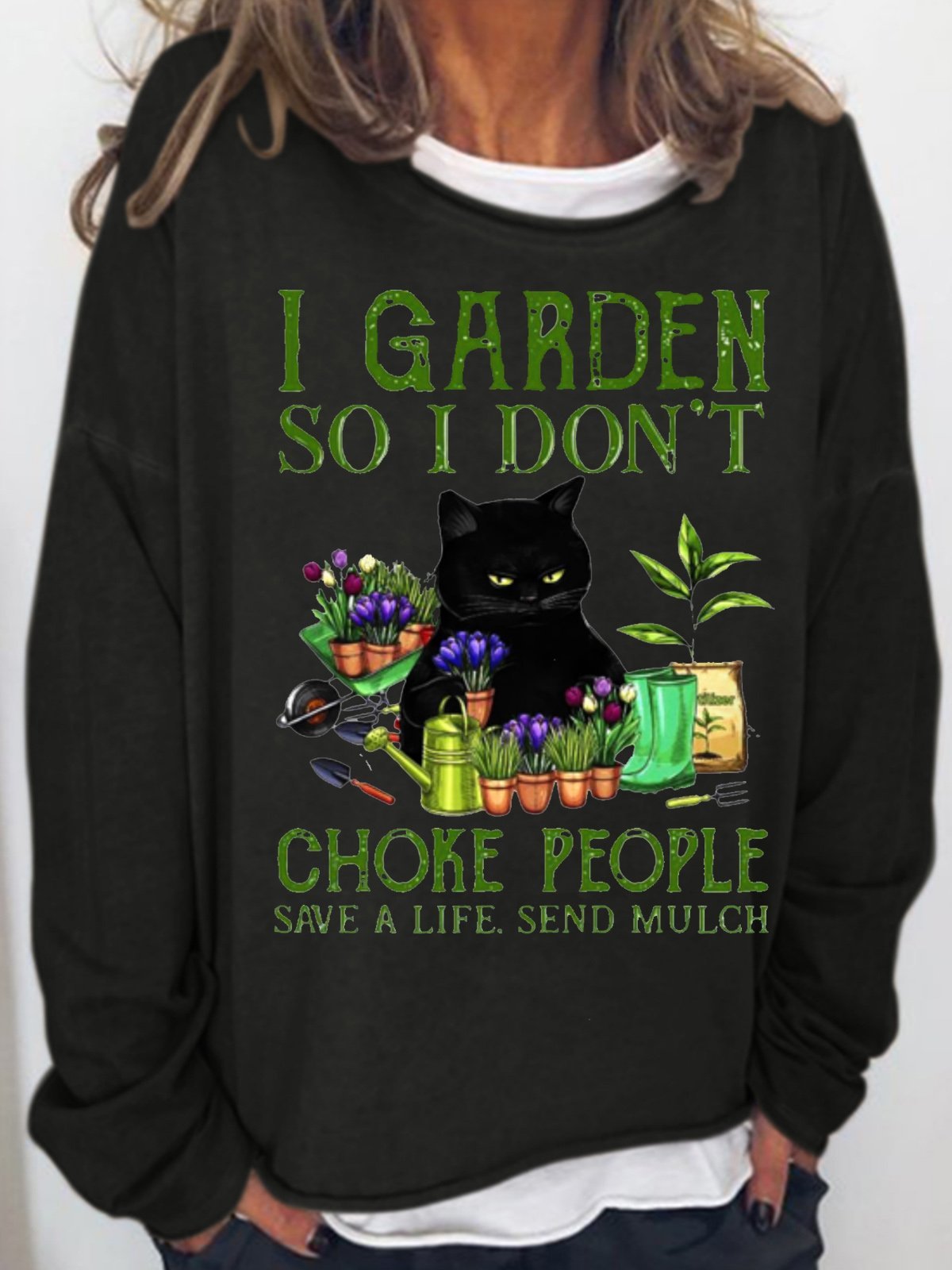 Womens Black Cat I Garden So I Don’t Choke People Save A Life Send Mulch Casual Sweatshirt