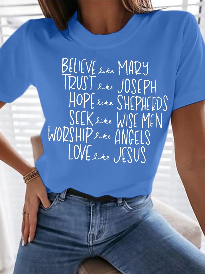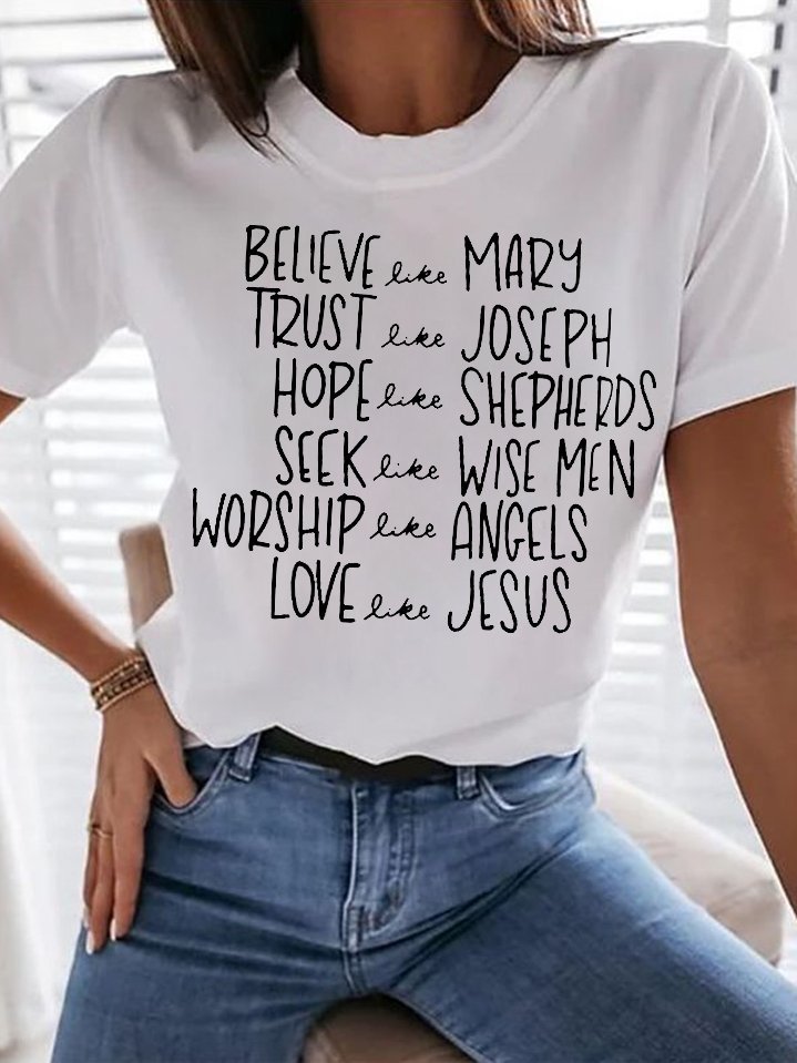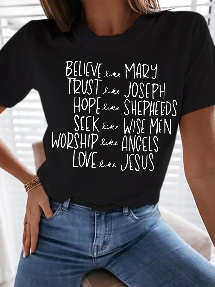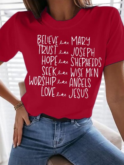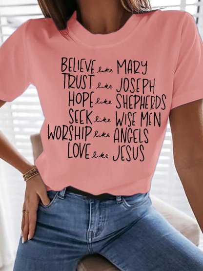 Women’s BELIEVE LIKE MARY Christian Letters Regular Casual Cotton T-Shirt